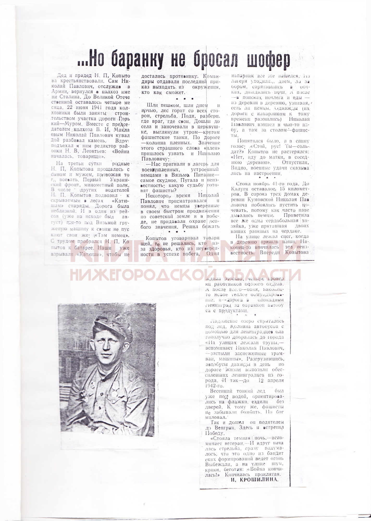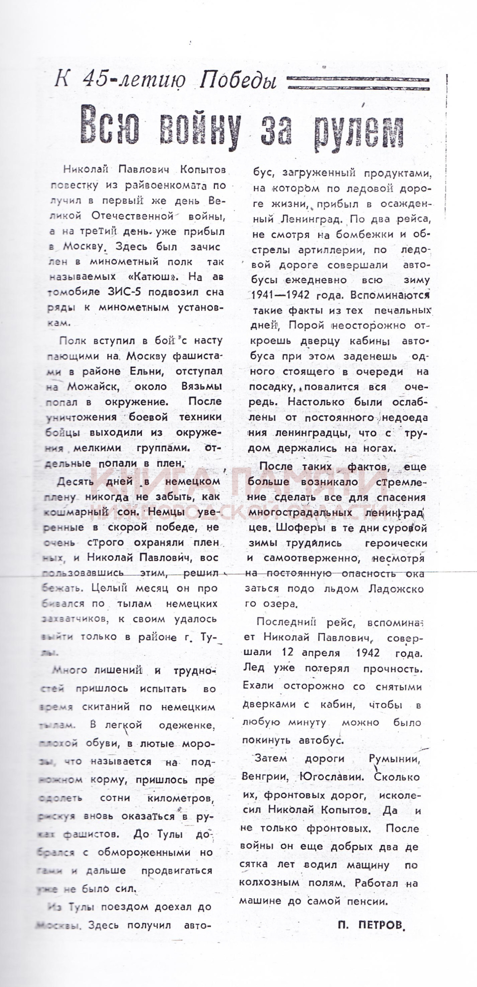 Далее боевой путь Николая Павловича Копытова пролегал через блокадный Ленинград. Водителю автомашины приходилось по «Дороге жизни» доставлять в Ленинград продукты, а оттуда эвакуировать женщин и детей. Бояться приходилось не за свою жизнь, а за хлеб, которого ждут ленинградцы, за жизнь детей, которая в этот момент находилась в руках Николая Павловича.