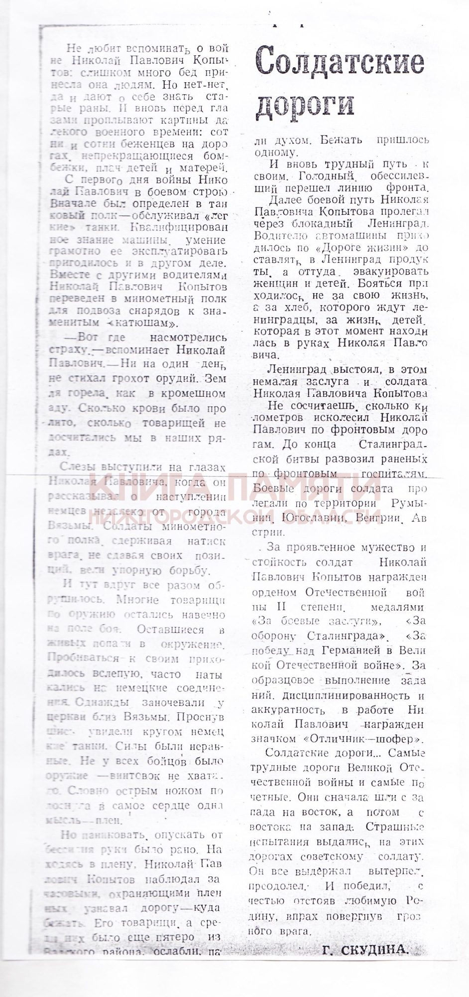 С первого дня войны Николай Павлович в боевом строю. Вначале был определен в танковый полк-обслуживал «легкие» танки. Квалифицированное знание машины, умение грамотно ее эксплуатировать пригодилось и в другом деле. Вместе с другими водителями Николай Павлович Копытов переведен в минометный полк для подвоза снарядов к знаменитым «катюшам».