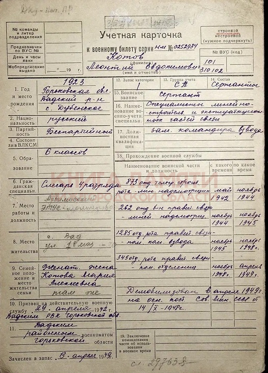 О том, что началась война, Леонтий Евдокимович Котов узнал от соседа, работавшего бригадиром колхоза. Тому сообщили об этом в конторе хозяйства. Весть о начале войны тут же разнеслась по селу Дубенское. Жители группами собирались возле домов, говорили о скорой мобилизации. Леонтий тогда только что приехал в родное село из Ленинграда, хотел провести дома отпуск. О возвращении на фабрику, где он работал помощником слесаря, не могло быть и речи. Один за другим односельчане призывались в армию. Село на глазах пустело. Работать Леонтий стал в колхозе, ожидая своей очереди призыва в армию. Весной 1942 года супруги Евдоким Тимофеевич и Марина Васильевна проводили на службу и младшего сына. Трое старших сыновей из семьи Котовых уже воевали. Леонтий Евдокимович вспоминает: