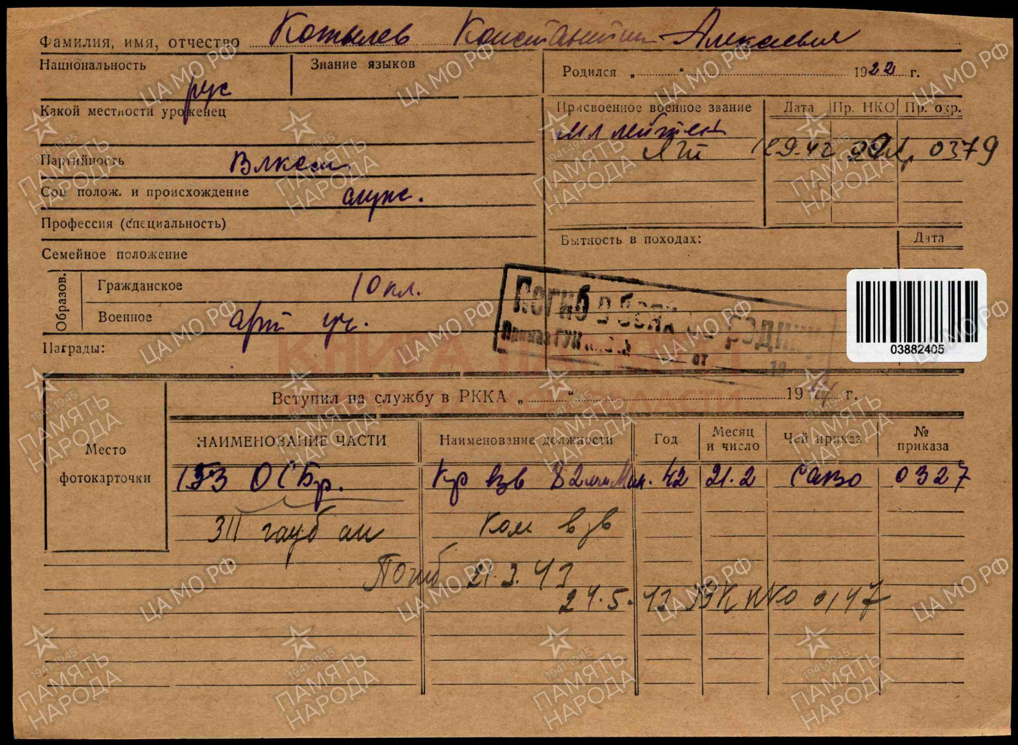 Погиб в бою 21.03.1943
