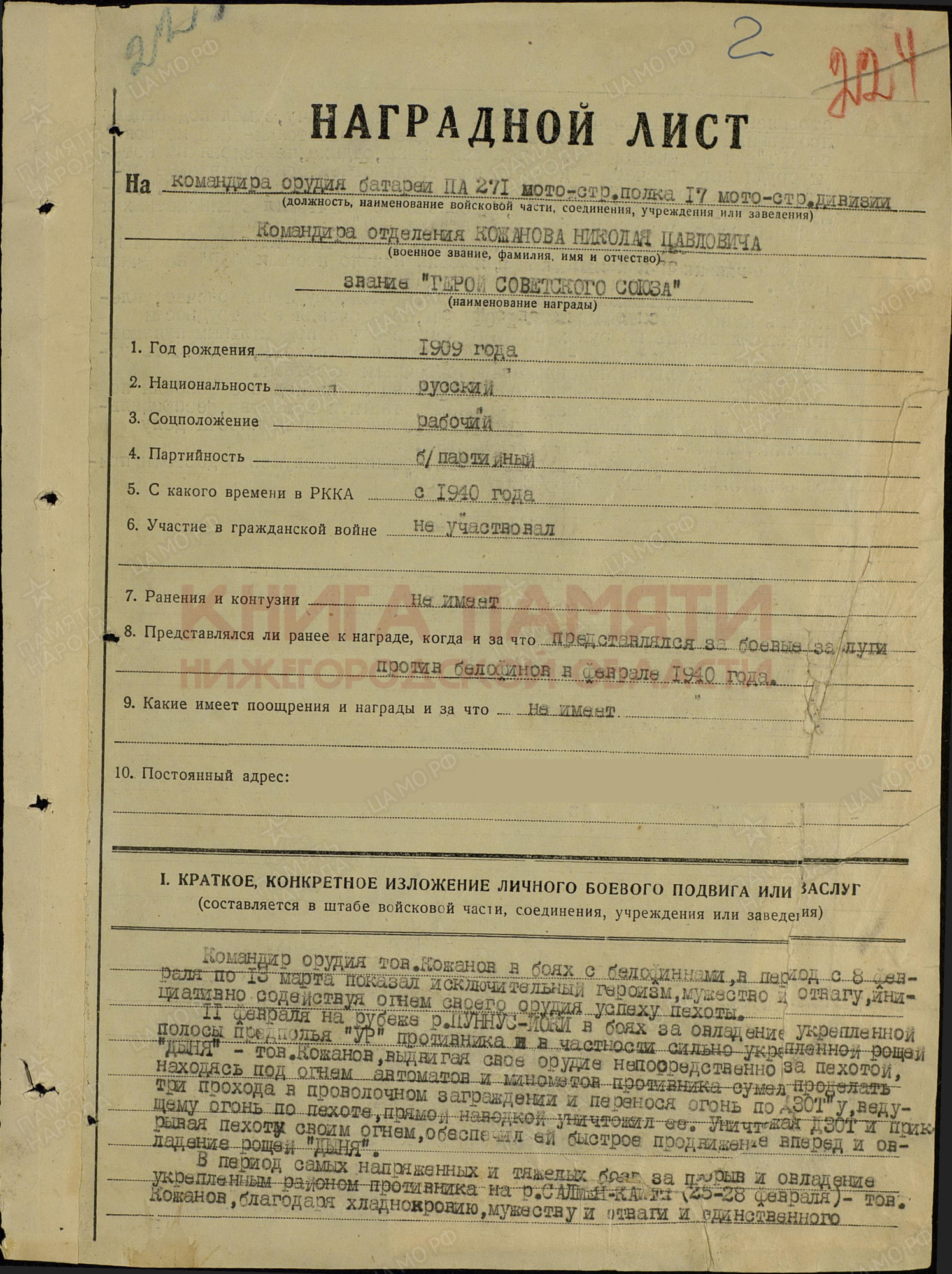 Командир орудия 271-го мотострелкового полка (17-я мотострелковая дивизия, 13-я армия, Северо-Западный фронт), младший командир Николай Кожанов с 8 февраля по 13 марта 1940 года в боях за овладение опорными пунктами противника на реках Пуннусйоки, Салмен-Кайта и Вуокса (Карельский перешеек) огнём орудия непрерывно поддерживал атаку пехоты, подавляя доты и другие вражеские огневые точки, чем способствовал успешному прорыву укреплённого района.