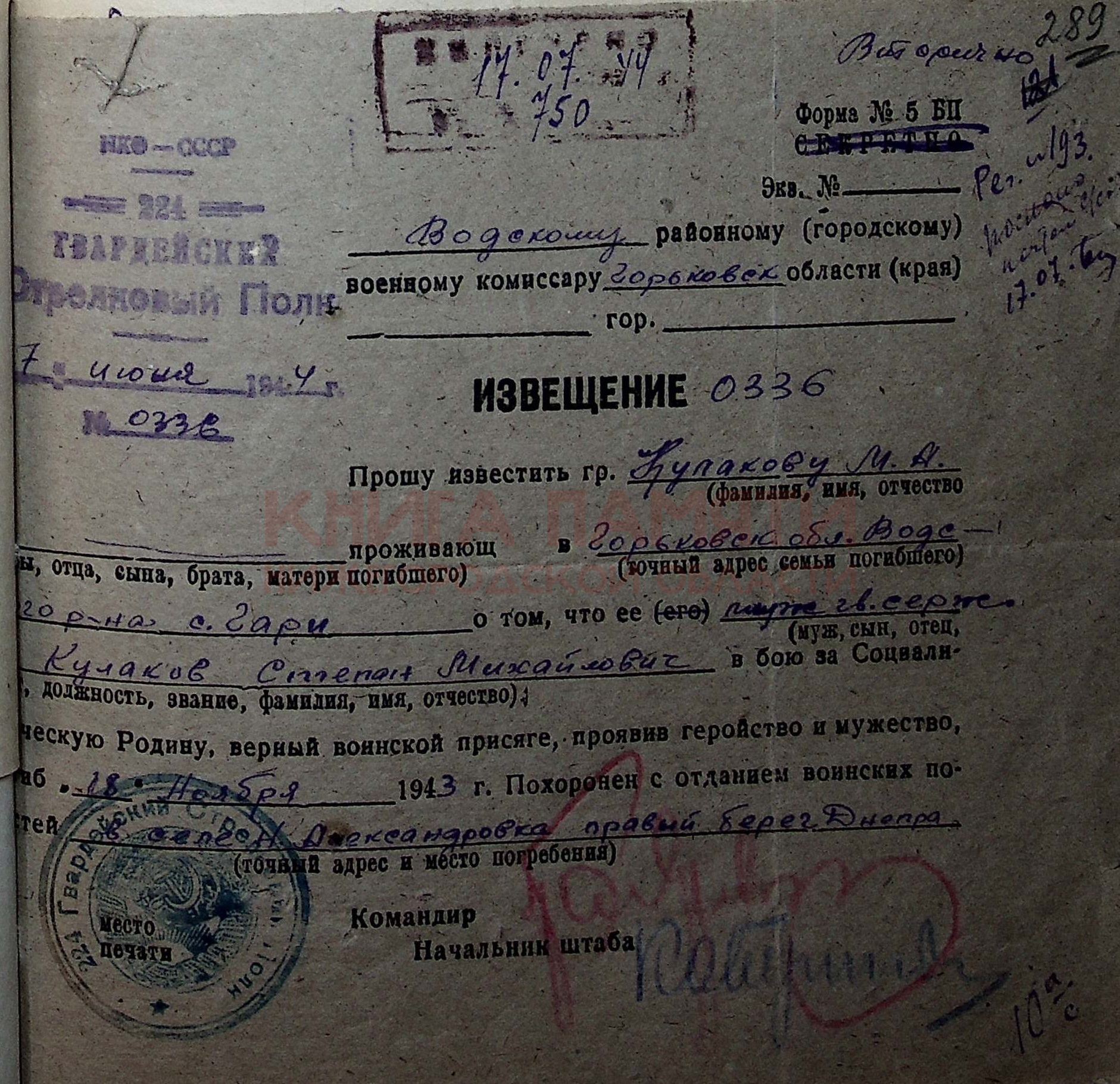 Погиб в бою 18.11.1943 г.
