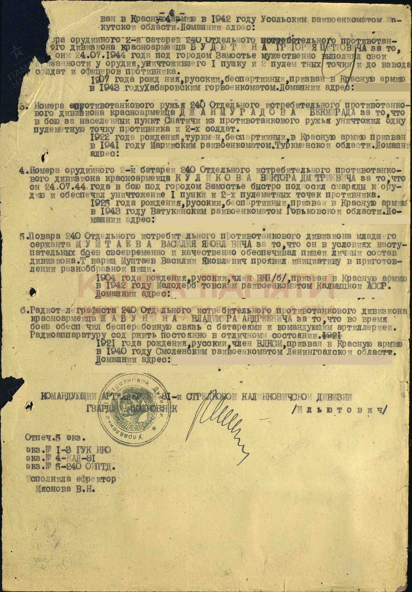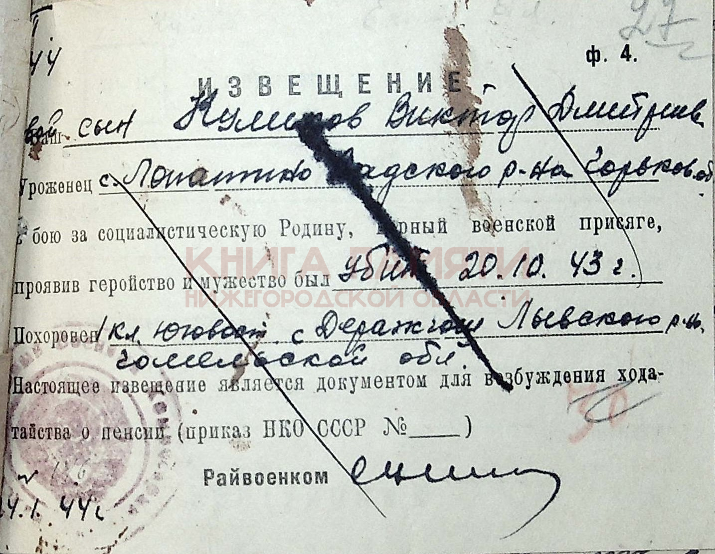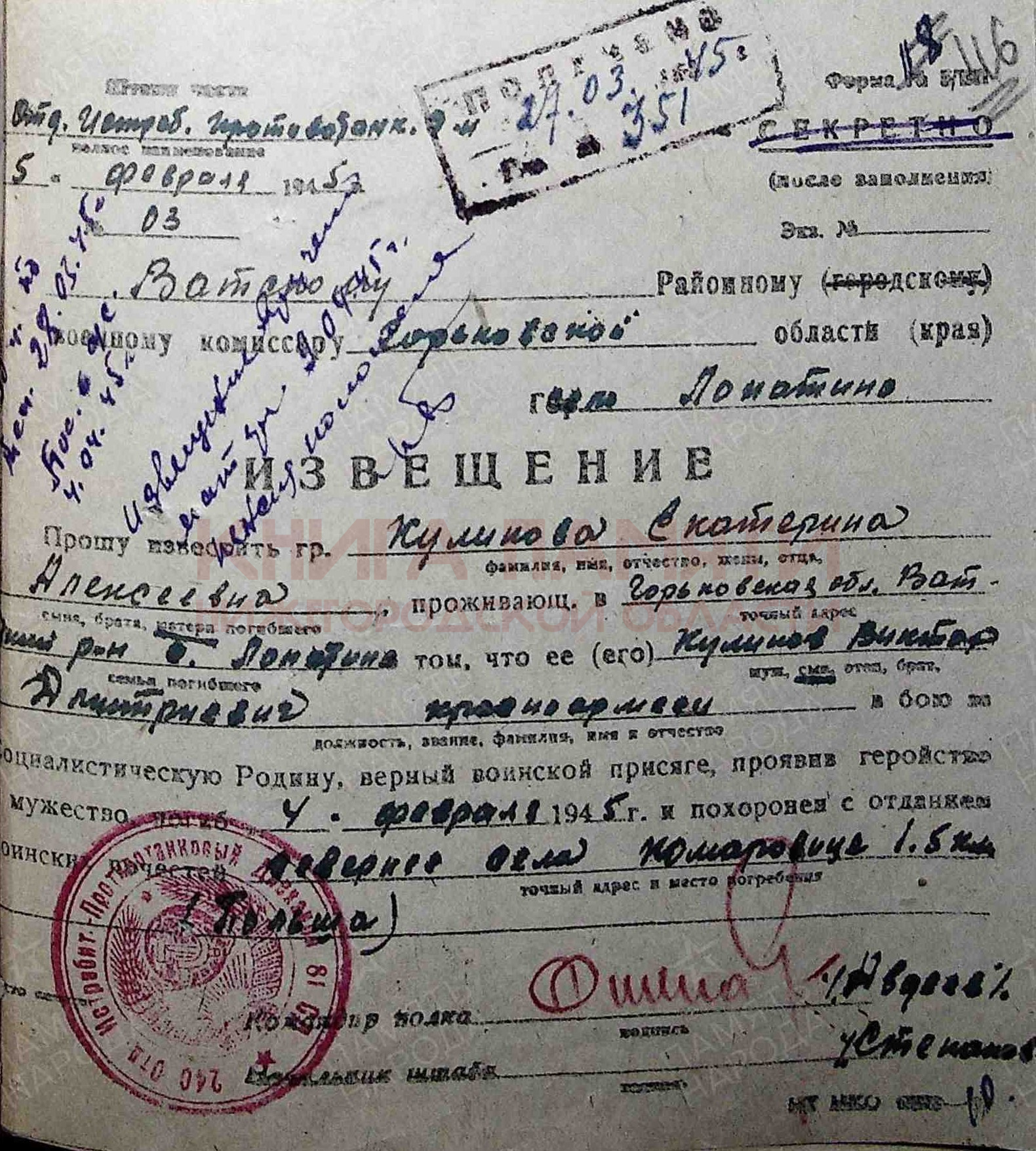 Погиб в бою 4 февраля 1945 г. Место захоронения - Белорусская ССР, Гомельская обл., Лоевский р-н, д. Деражичи, юго-восточнее, 1 км