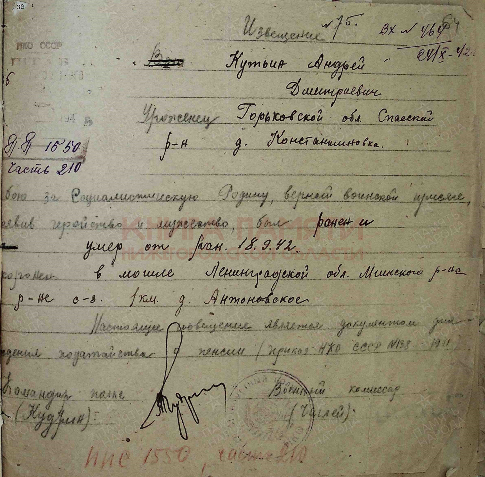 Похоронен в д. Антоновское Кировского р-на Ленинградской обл.