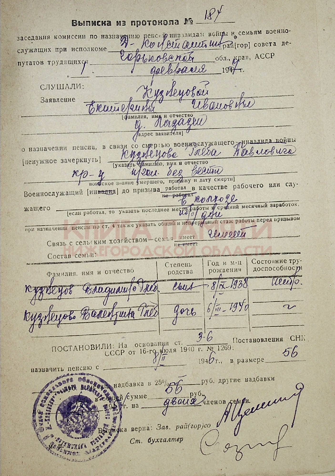 До войны работал в колхозе "Рассвет" рядовым колхозником. Призван на фронт в 1941г. Дальнеконстантиновским РВК, направлен по призыву в г.Горький, 771 стрелковый полк. В январе 1942г. пропал без вести. Жена Кузнецова Екатерина Ивановна 1919г.р., сын Владимир Глебович, 1938г.р., дочь Валентина Глебовна, 1940г., проживали в д.Лазазей.