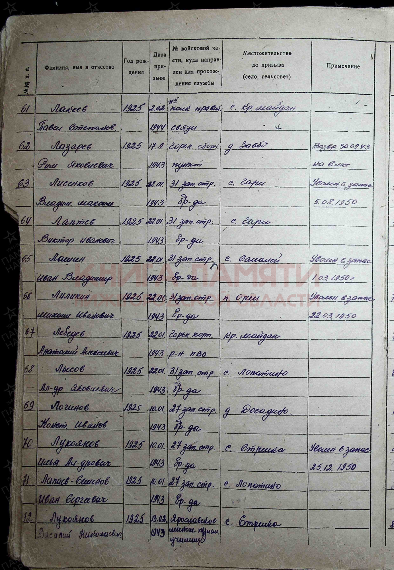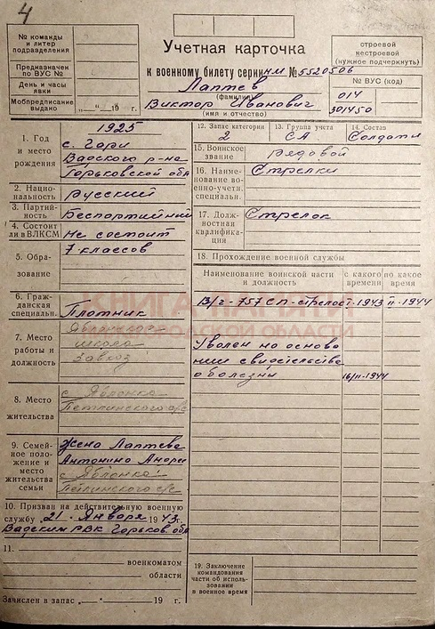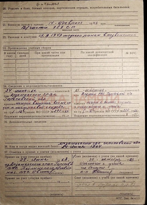 Уволен на основании свидетельства о болезни 16.02.1944 г.