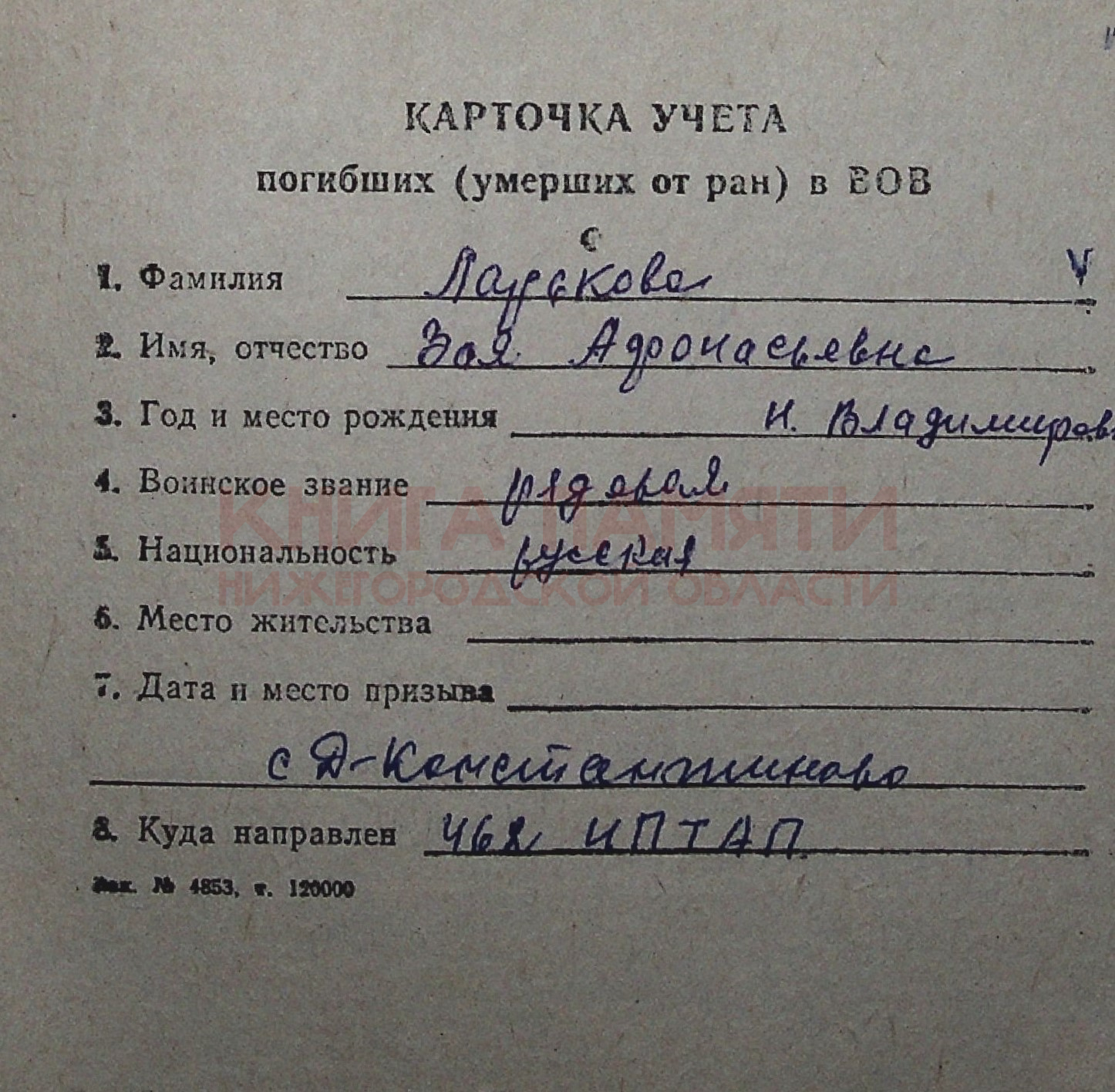 Уроженка д. Новая Владимировка Дадьнеконстантиновского района Горьковской области, до призва на фронт работала в колхозе "Заря". В августе 1942г.была призвана на фронт и направлена в 462 ИПТАП. На фронте погибла 22.08.1943г. Похоронена в районе д. Морозовка, Славянского района Сталинской области.