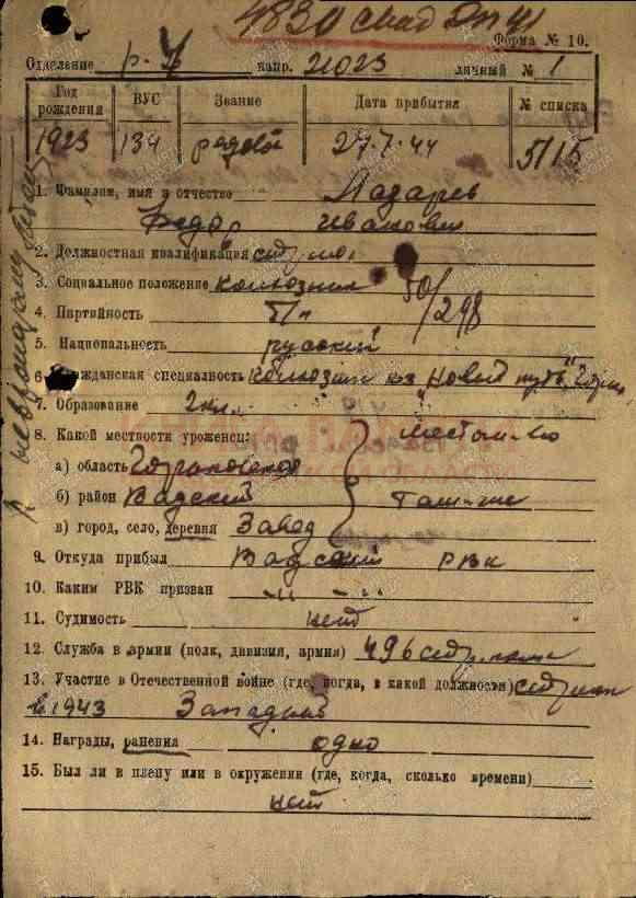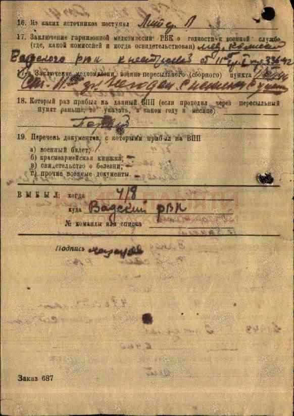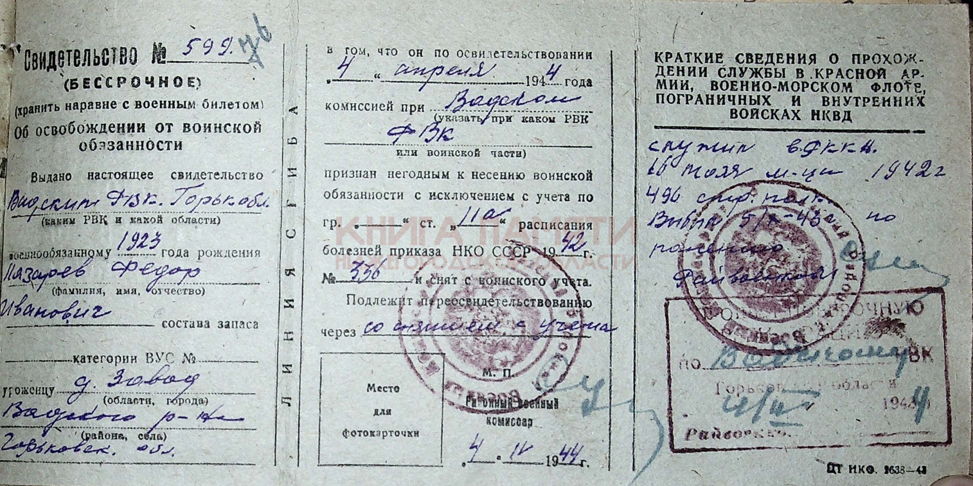 В 1943 г получил ранение. По осведетельствовании комиссией 4.04.1944 при Вадском РВК признан негодным к несению воинской обязанности с исключением с учета, снят с воинского учета.