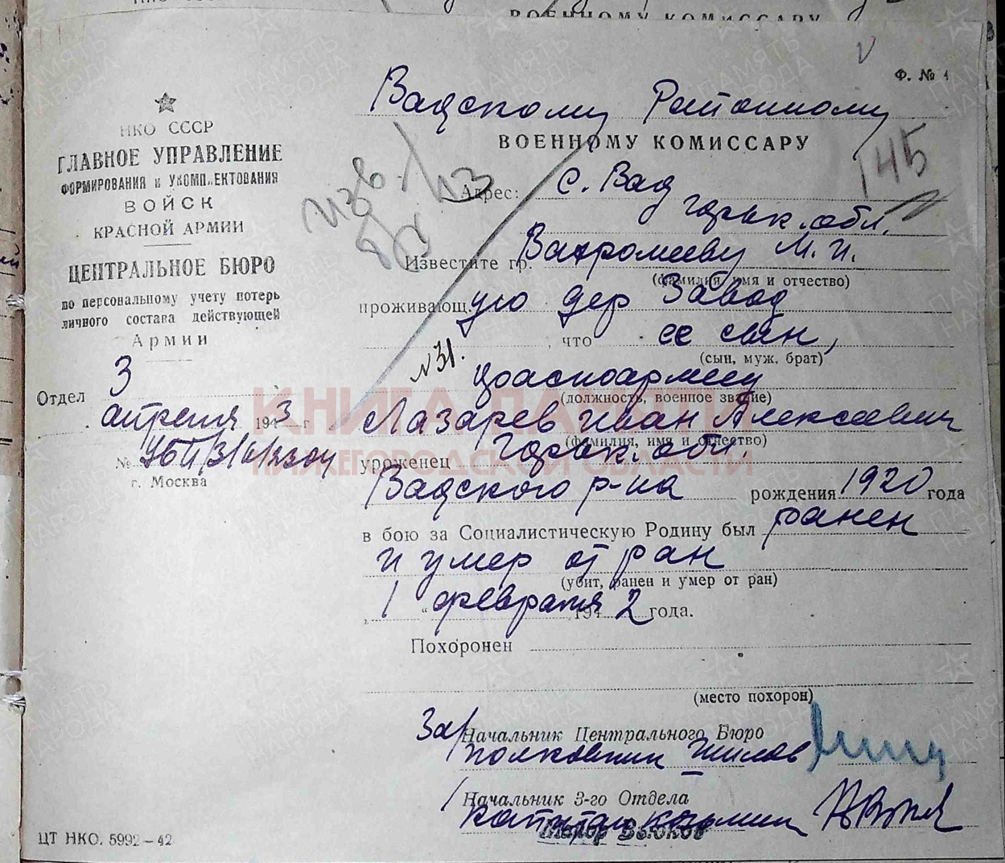 Ранен, умер от ран 1 февраля 1942 г.