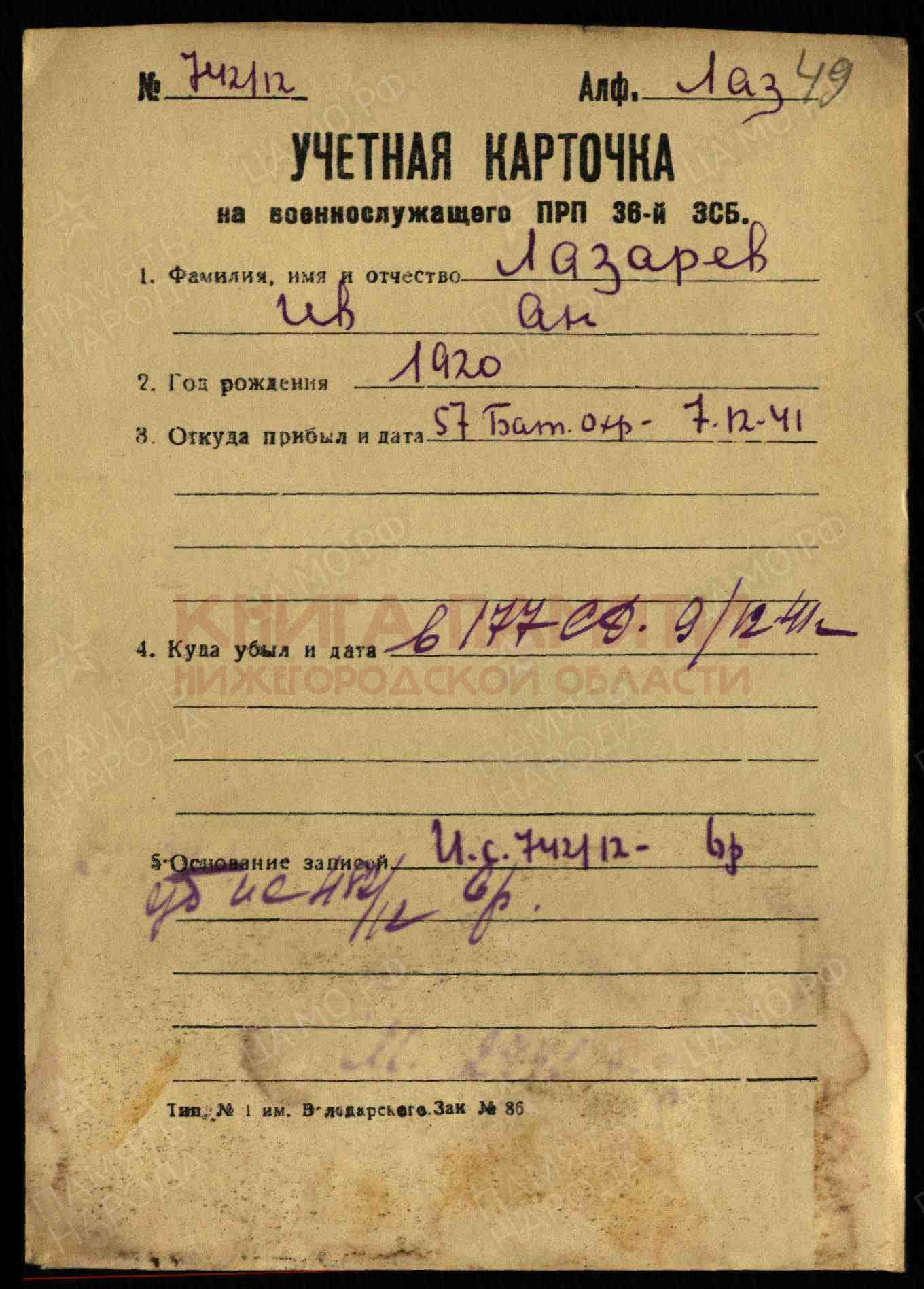 Ленинградский военно-пересыльный пункт, Ленинградская обл., г. Ленинград; 223 армейский запасной стрелковый полк; 36 запасная стрелковая бригада; 57 б-н охраны