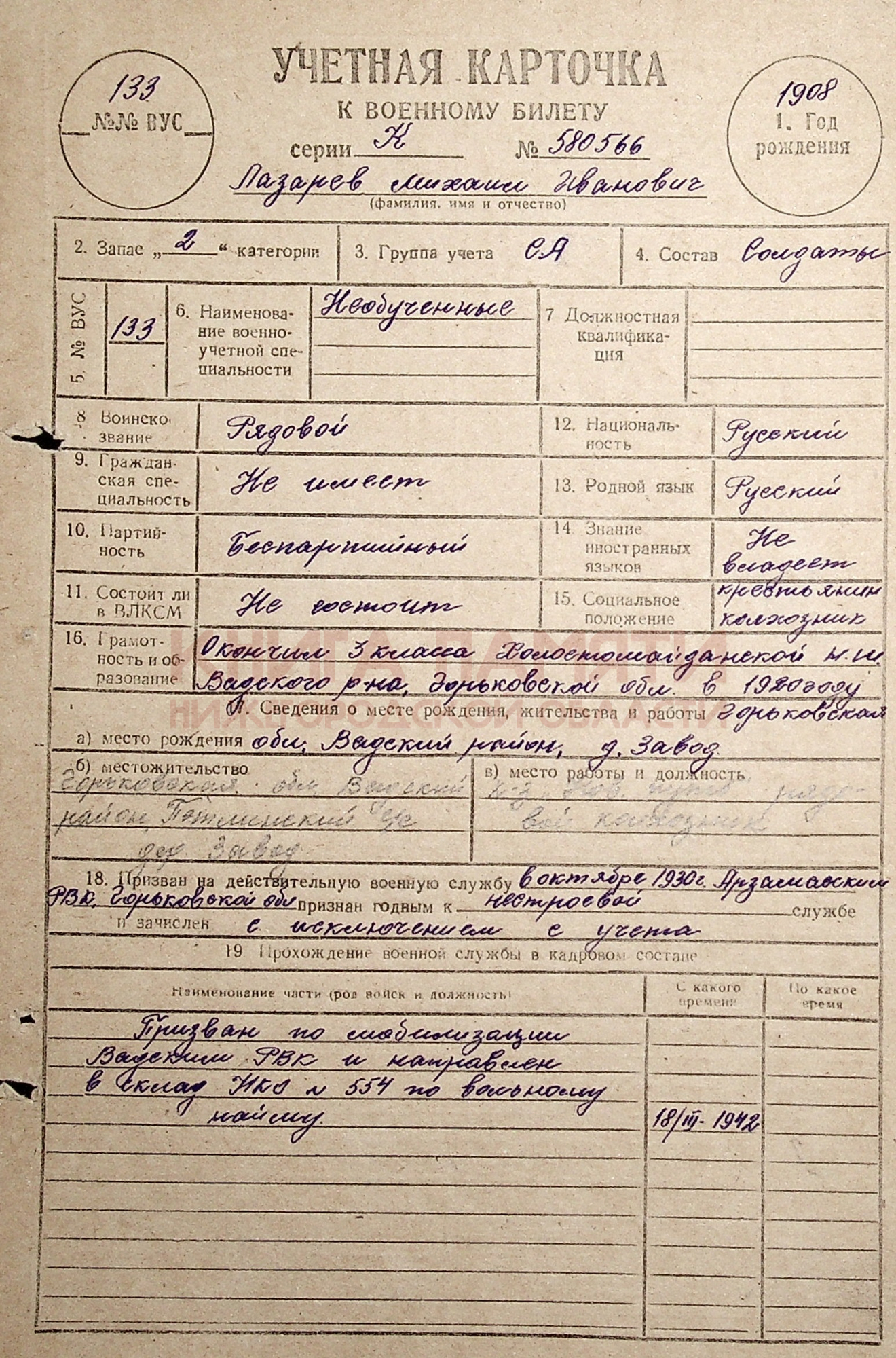 Призван по мобилизации 18.03.1942 и направлен в склад НКО №554 по вольному найму. Военную присягу не принимал. В ВОВ не участвовал.
