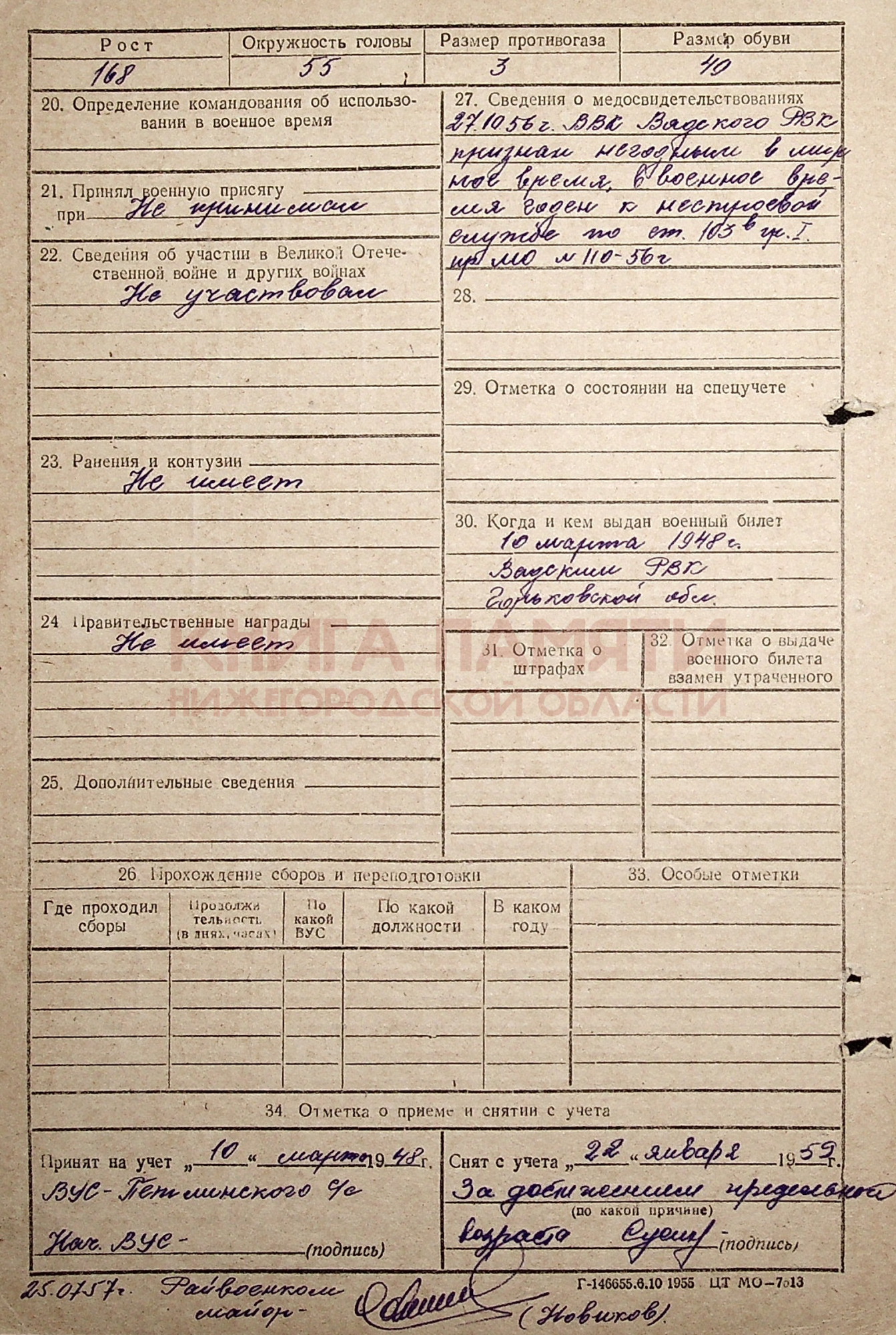 27.10.1956 признан негодным в мирное время, в военное время годен к нестроевой службе. Умер в 1981 г.