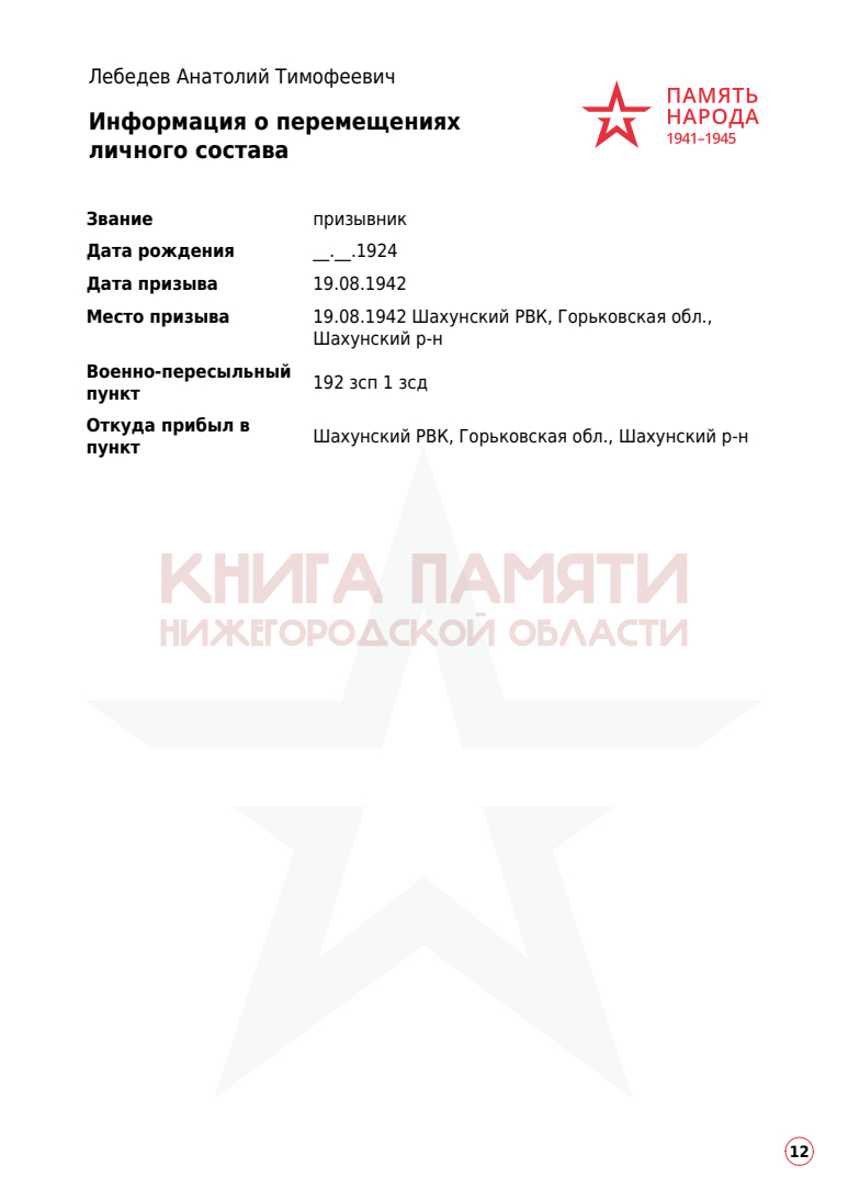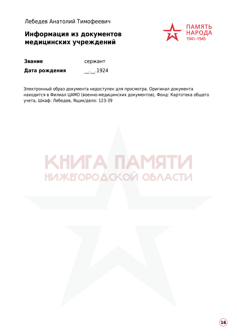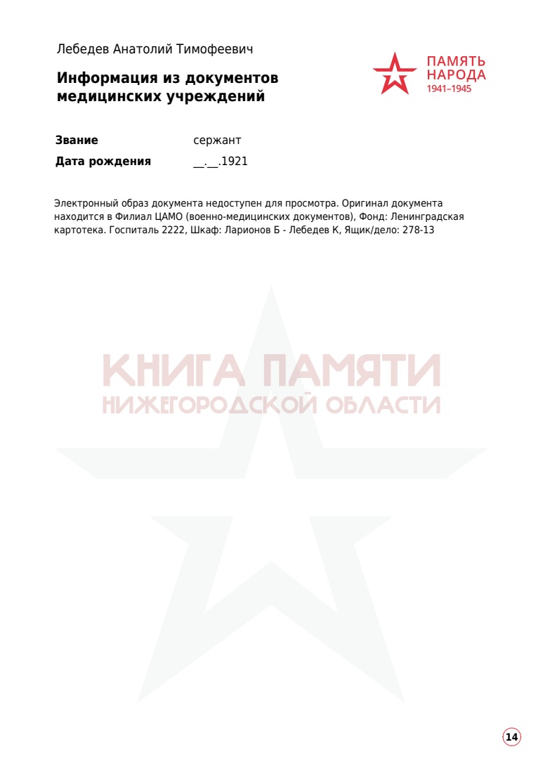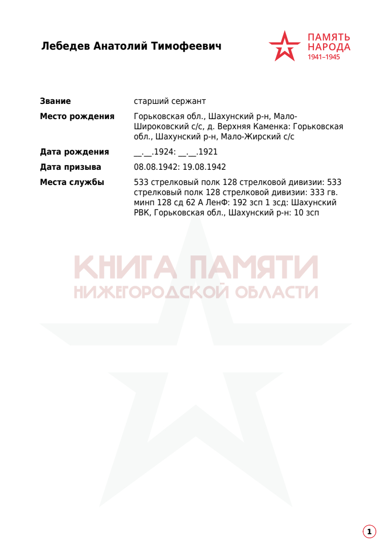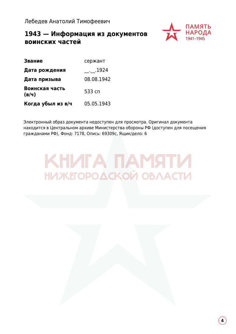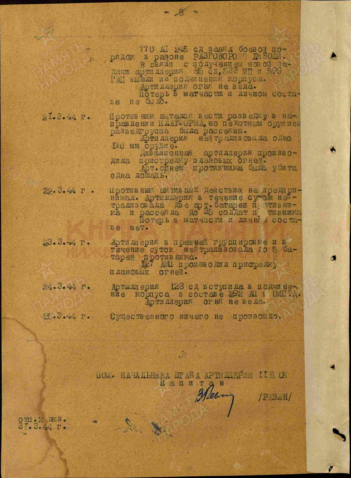 Воинская часть: 533 сп, Дата выбытия: 19.03.1944,Причина выбытия: эвакуирован в тыл, Госпиталь: ЭГ 991