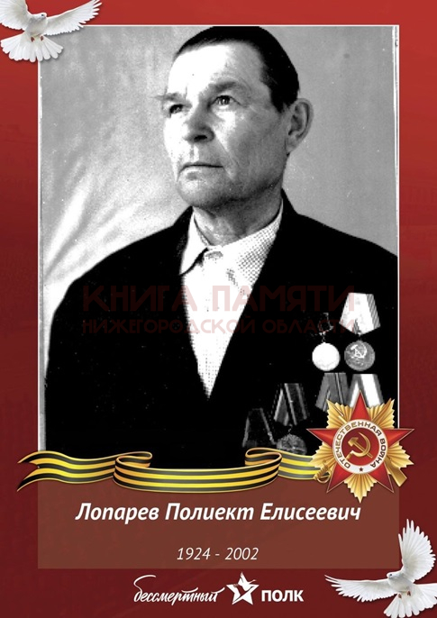Был призван в армию в 1942 году. После небольшой подготовки его зачислили в противотанковую бригаду и, по его желанию, направили в маршевую роту, а с марта 1943 года он был зачислен в 117-й полк. Через 5 месяцев, в августе 1943 года, Полиект Елисеевич был уже на передовой. Сначала наши войска держали оборону, а затем 117-й полк пошел в наступление, тут его ранило. Это происходило на плацдарме в районе р. Северный Донец. После выздоровления его зачислили в минометный полк телефонистом. И вновь он попал на передовую. Немцы шли в наступление, были сильные бомбежки и нашим войскам пришлось отступать. Особенно жесткие бои шли на Висловском плацдарме, но после проведения артиллерийской подготовки ситуация изменилась, началось наступление советских войск. Также он участвовал в освобождении г. Ченстохова. Всем бойцам была вынесена благодарность, Полиект Елисеевич был награжден медалью «За Отвагу». На пути к Праге начался артобстрел, его еще раз ранило. Известие о победе он получил уже в госпитале.