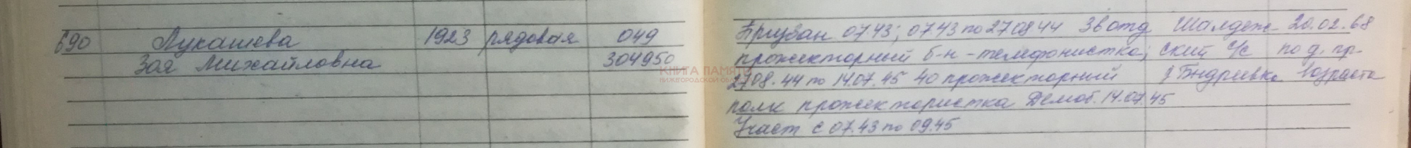 Украинский фронт, 07.1943 - 27.08.1944 36 отд.прожекторный б-н - телефонистка, 27.08.1944 - 14.07.1945 40 прожекторный полк -прожектористка. Участ. ВОВ 07.1943 - 09.05.1945.