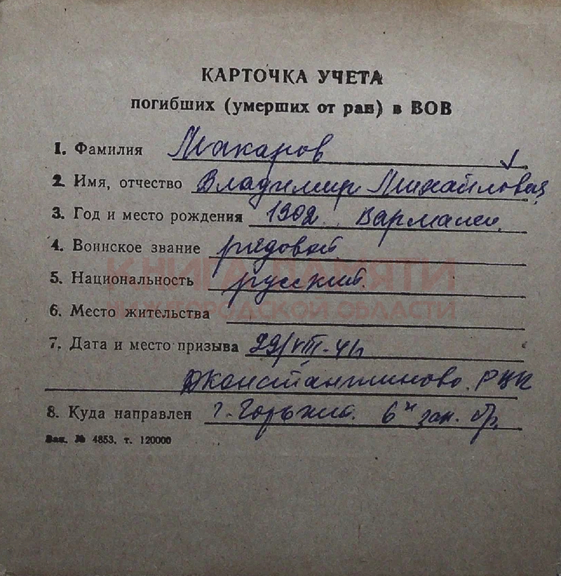 Уроженец села Вармалей Дальнеконстантиновского р-на. Был призван на фронт 29.08.1941г. Служил рядовым солдатом в составе 6 запасной бригады. Погиб в мае 1945г. Похоронен в г. Махачкала.