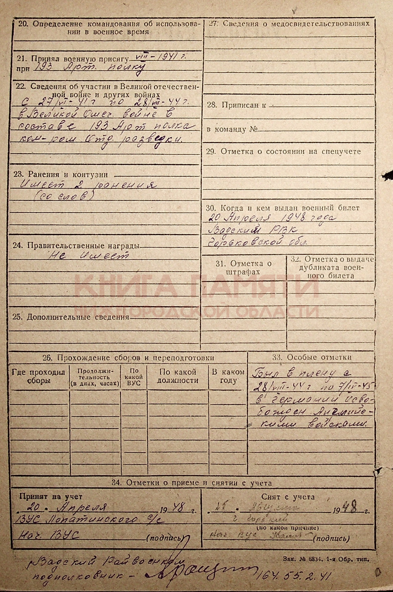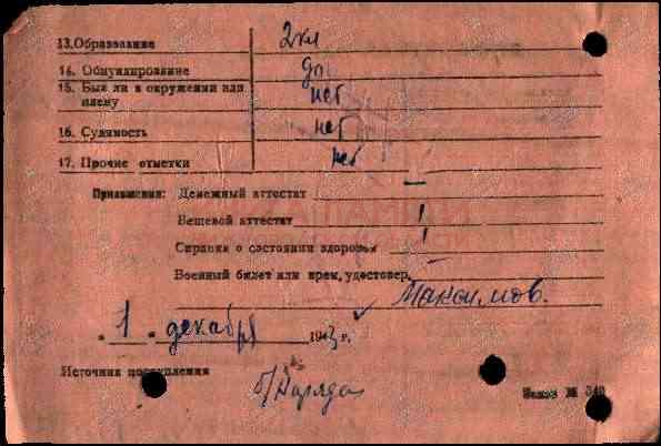 Был в плену с 28.08.1944 до 07.04.1945 в Германии. Демобилизован 25.09.1945 г.