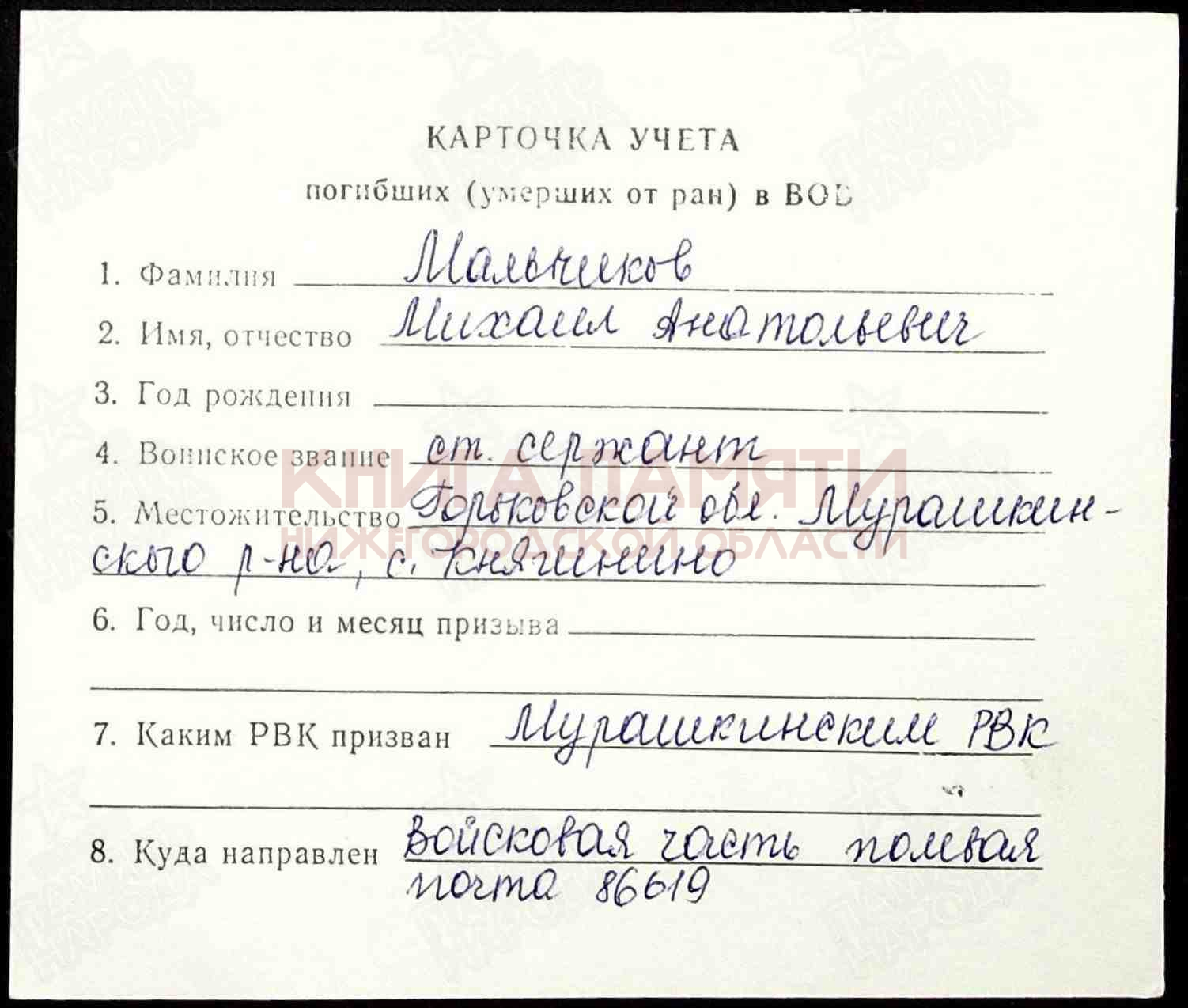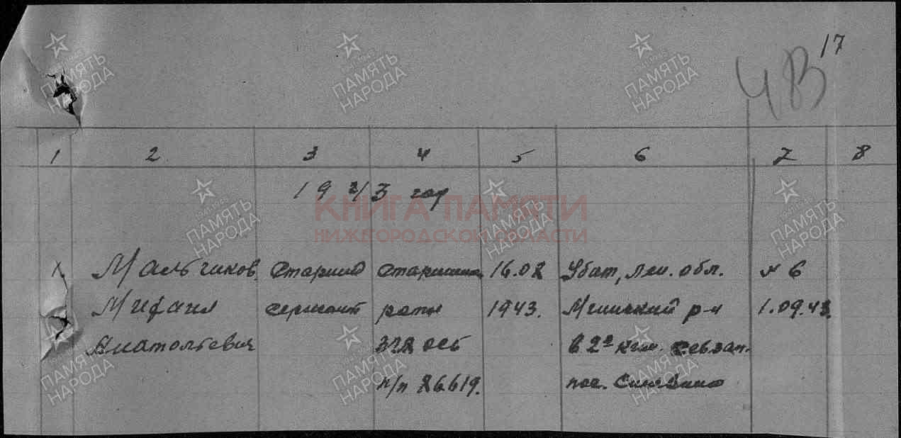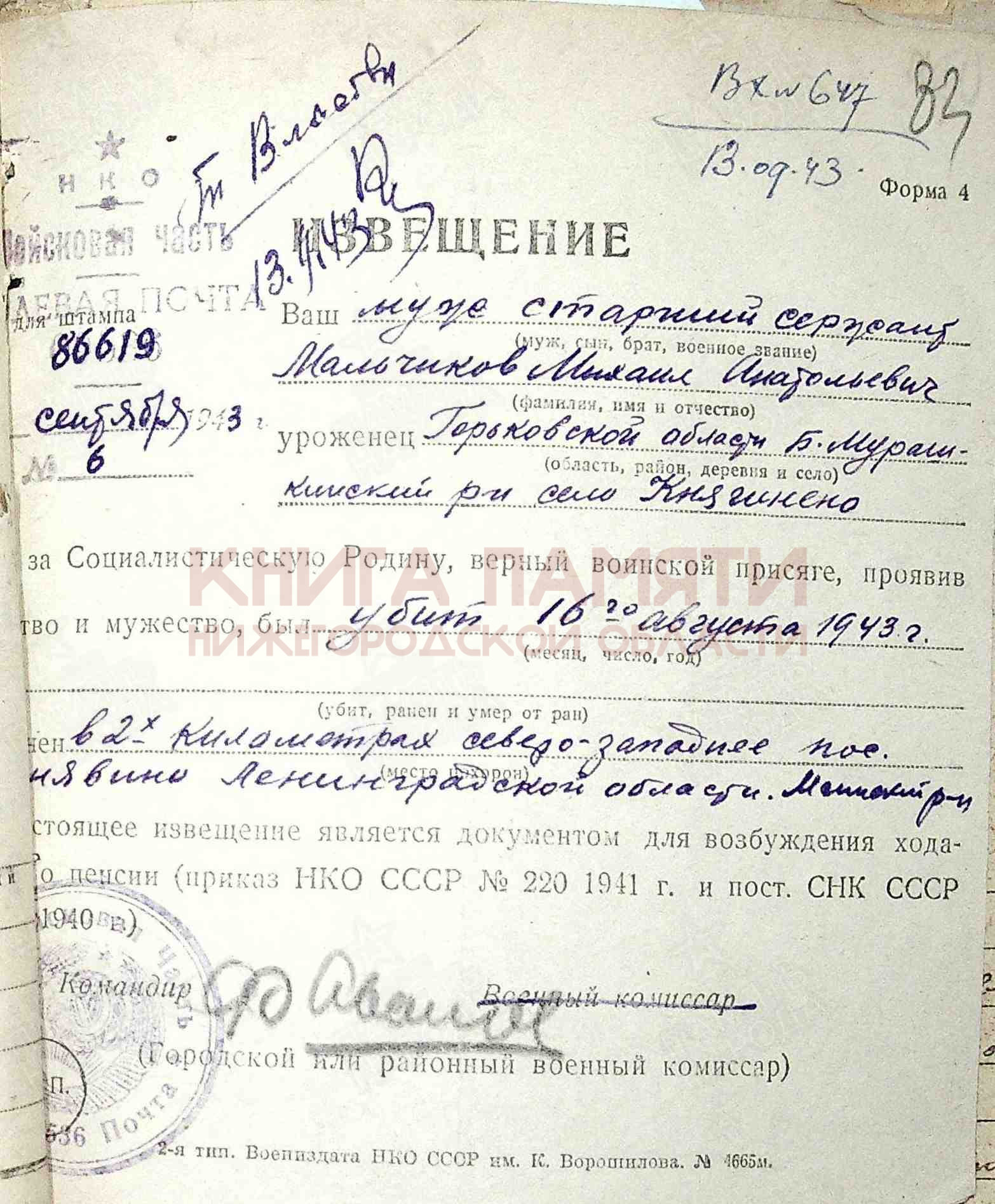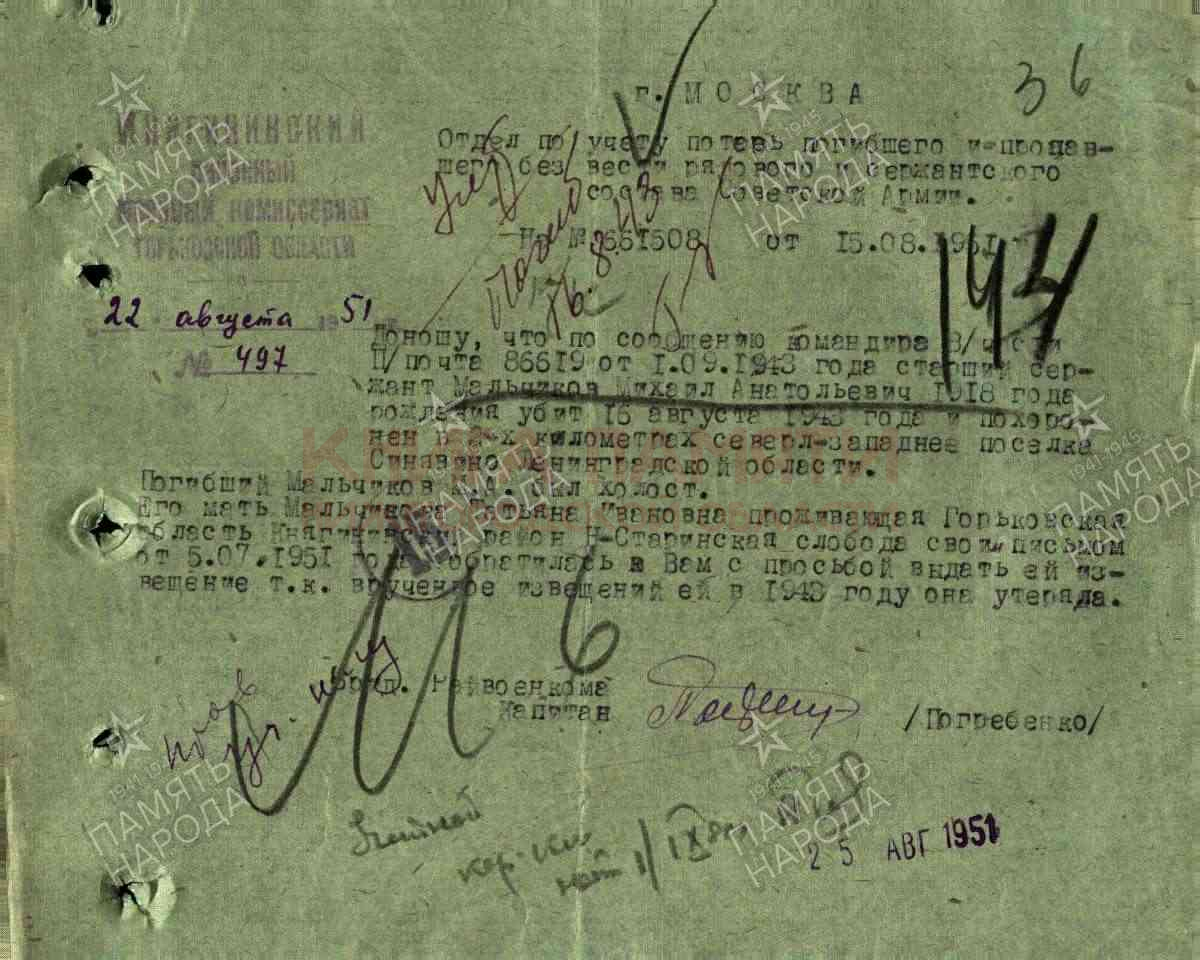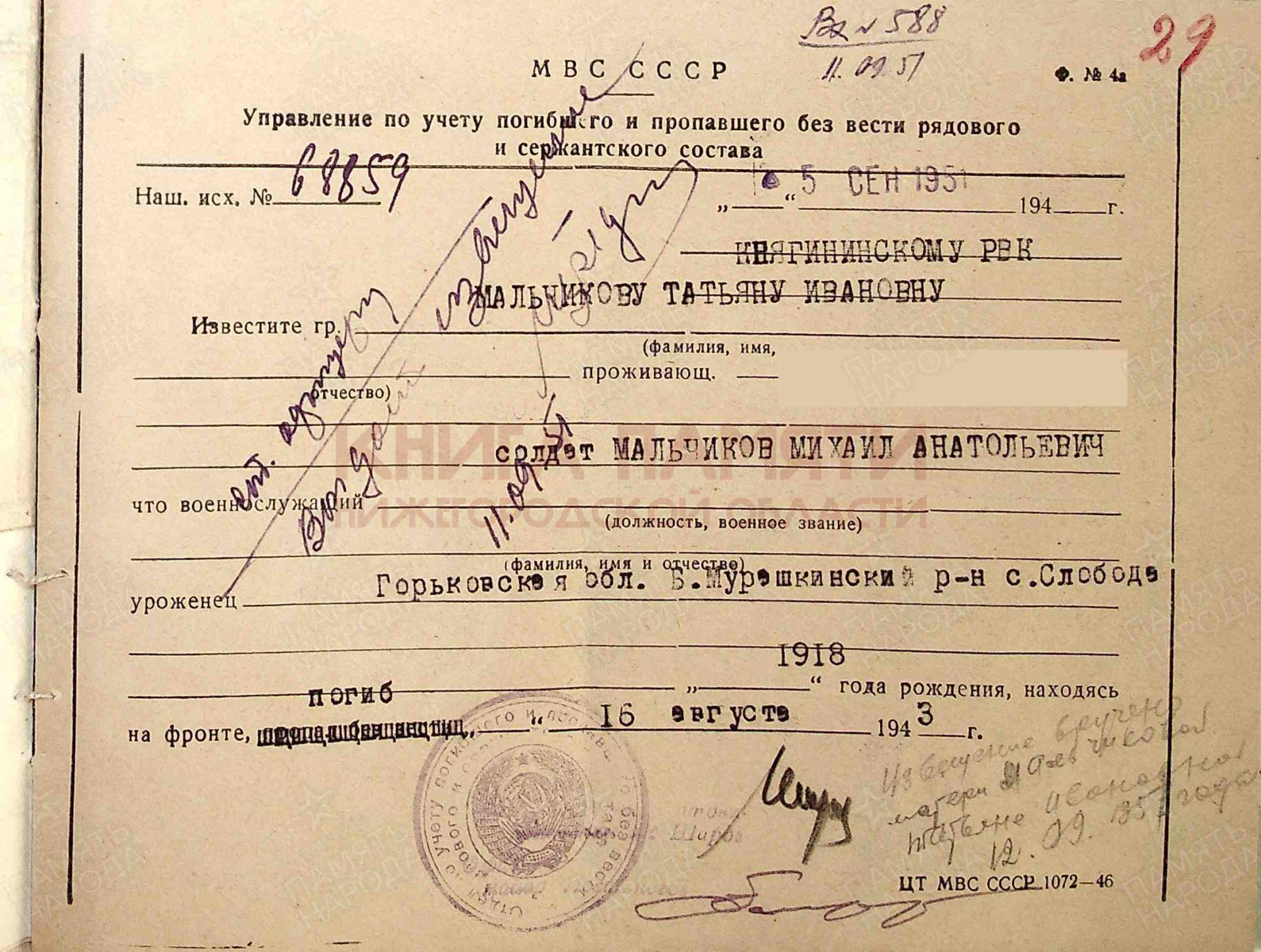 Погиб в бою 16.08.1943. Похоронен в п. Синявино Кировского района Ленинградской области