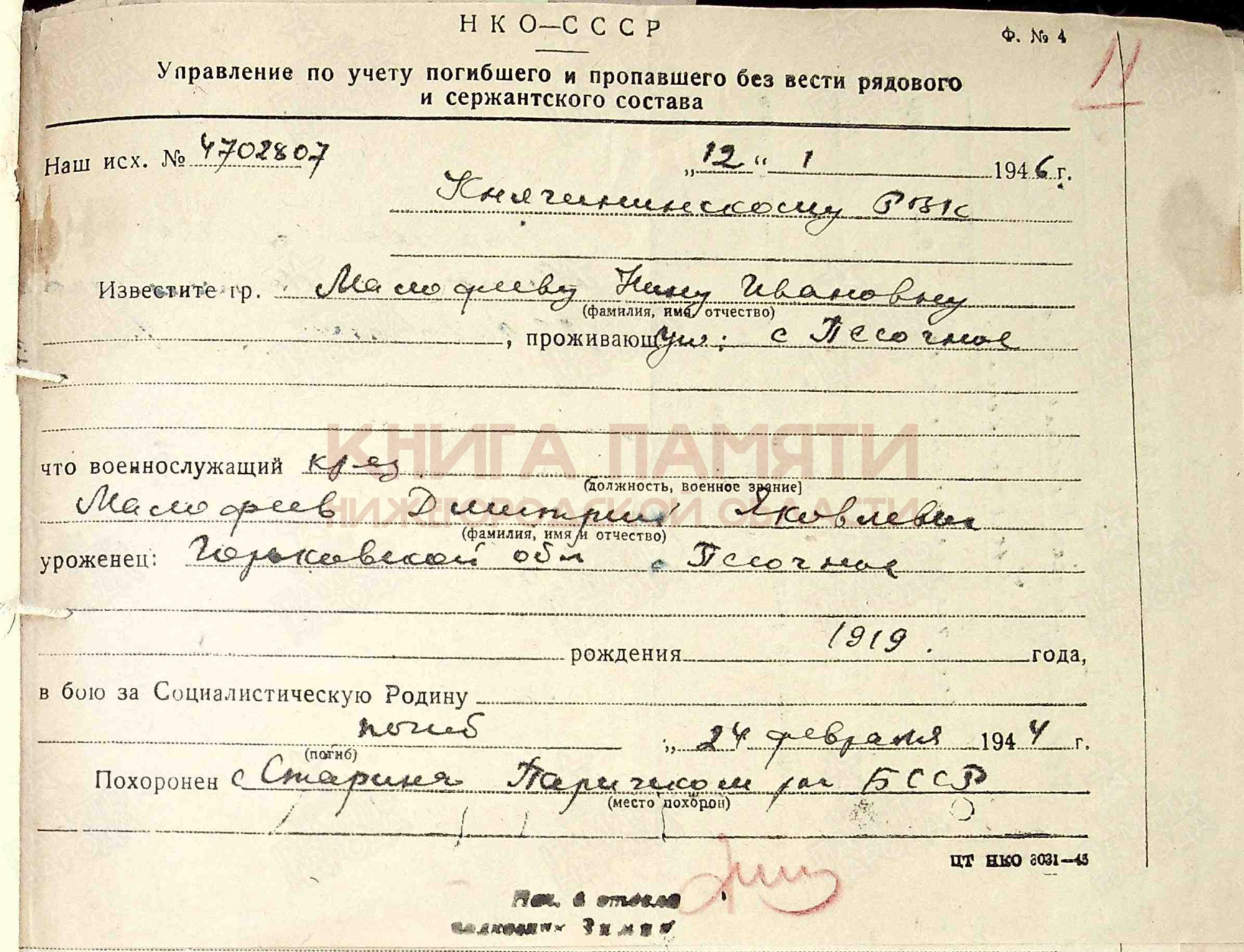 Погиб в бою 24 февраля 1944 года