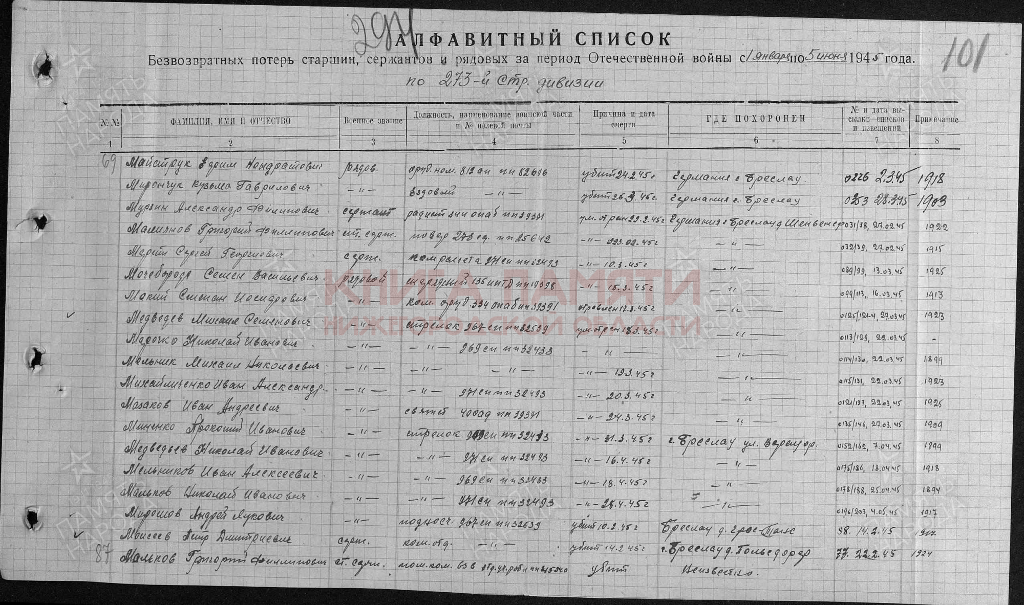 Место захоронения: Польша, Вроцлавское воев., пов. Вроцлавский, с. Шенвассер, парк; Германия, г. Бреслау, южнее, 11 км, с. Шенвелер, парк.