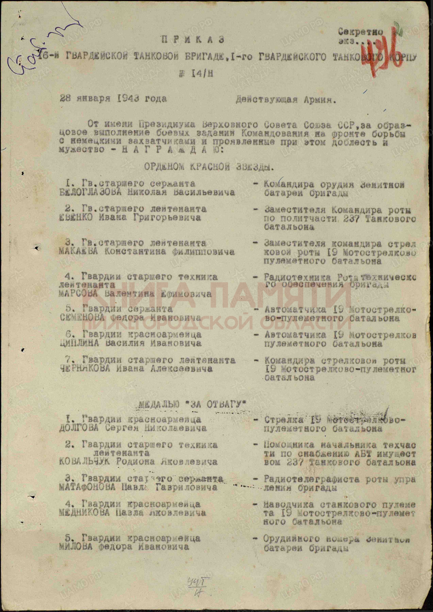 Правую руку он оставил на фронте. Так что он и отличный труженик, и бесстрашный защитник своей Родины. О последнем говорят многие боевые награды: орден Отечественной войны II степени, медали «За боевые заслуги», «За отвагу», «За оборону Сталинграда», «За победу над Германией в Великой Отечественной войне 1941-45 гг». Награжден он и юбилейными медалями: «Двадцать лет Победы в Великой Отечественной войне 1941-45 гг» и «Пятьдесят лет вооруженных Сил СССР», а также Знаком «25 лет Победы в Великой Отечественной войне», удостоверение к нему выдано за подписью Министра Вооруженных Сил СССР А.Гречко.