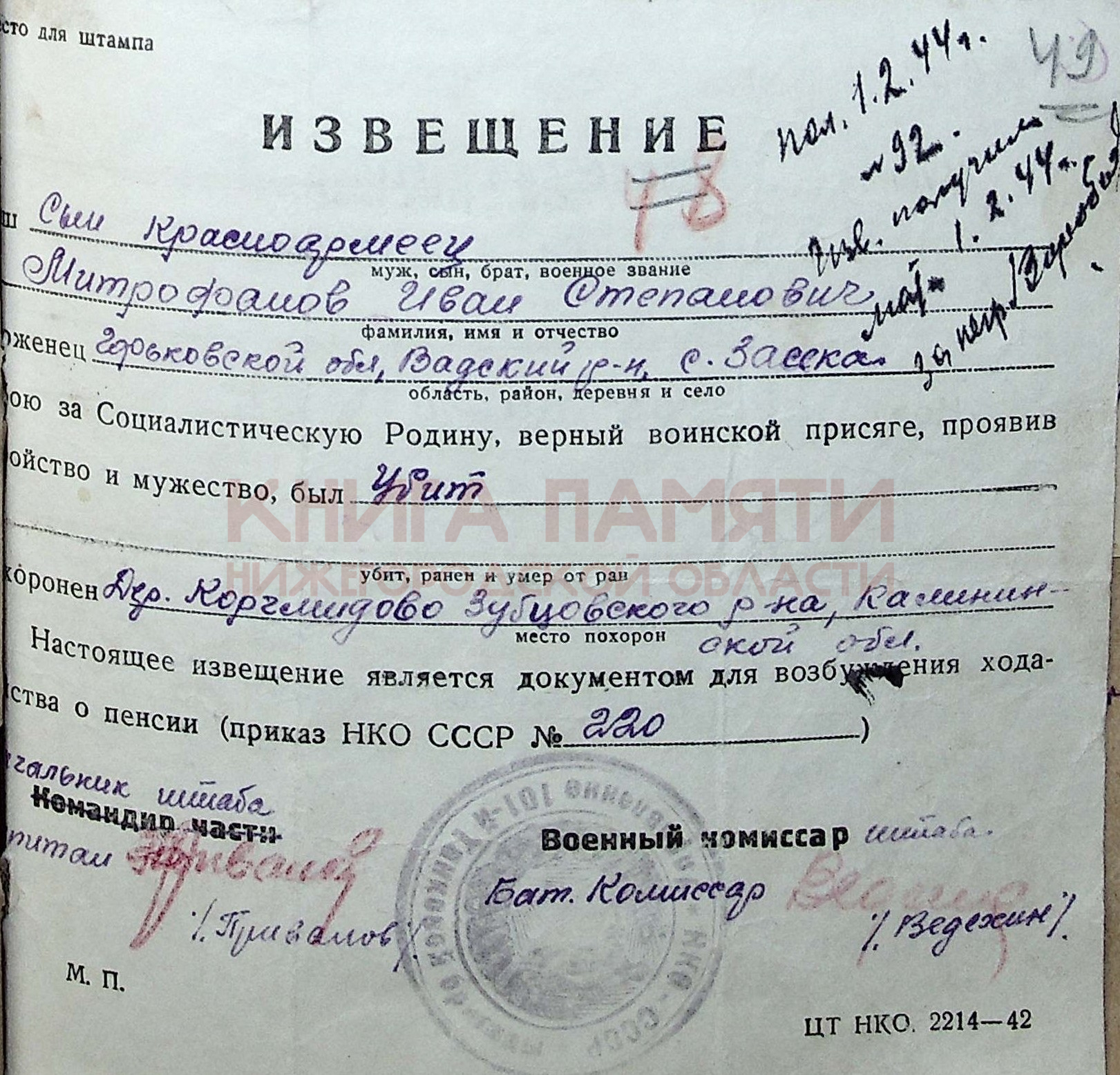 Погиб в бою 4.08.1942 (янв. 1944, не позднее 01.02.1944)
