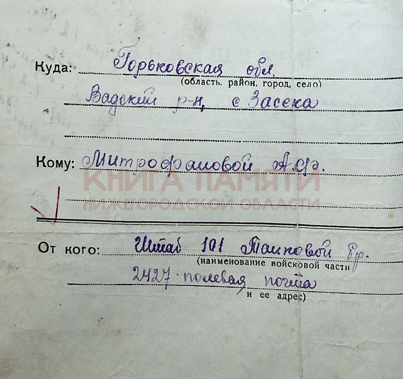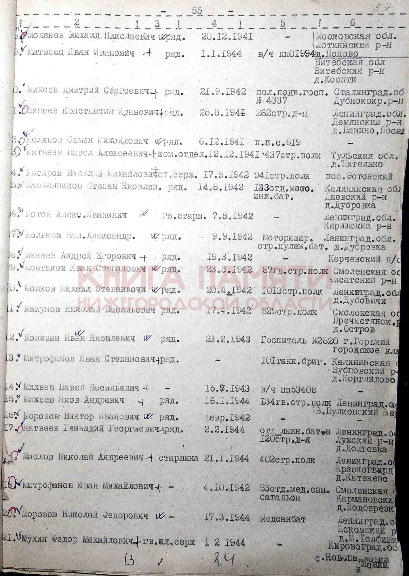 похоронен: Тверская обл., Зубцовский р-н, д. Корчмидово ; Калининская обл., Зубцовский р-н, д. Корчмидово