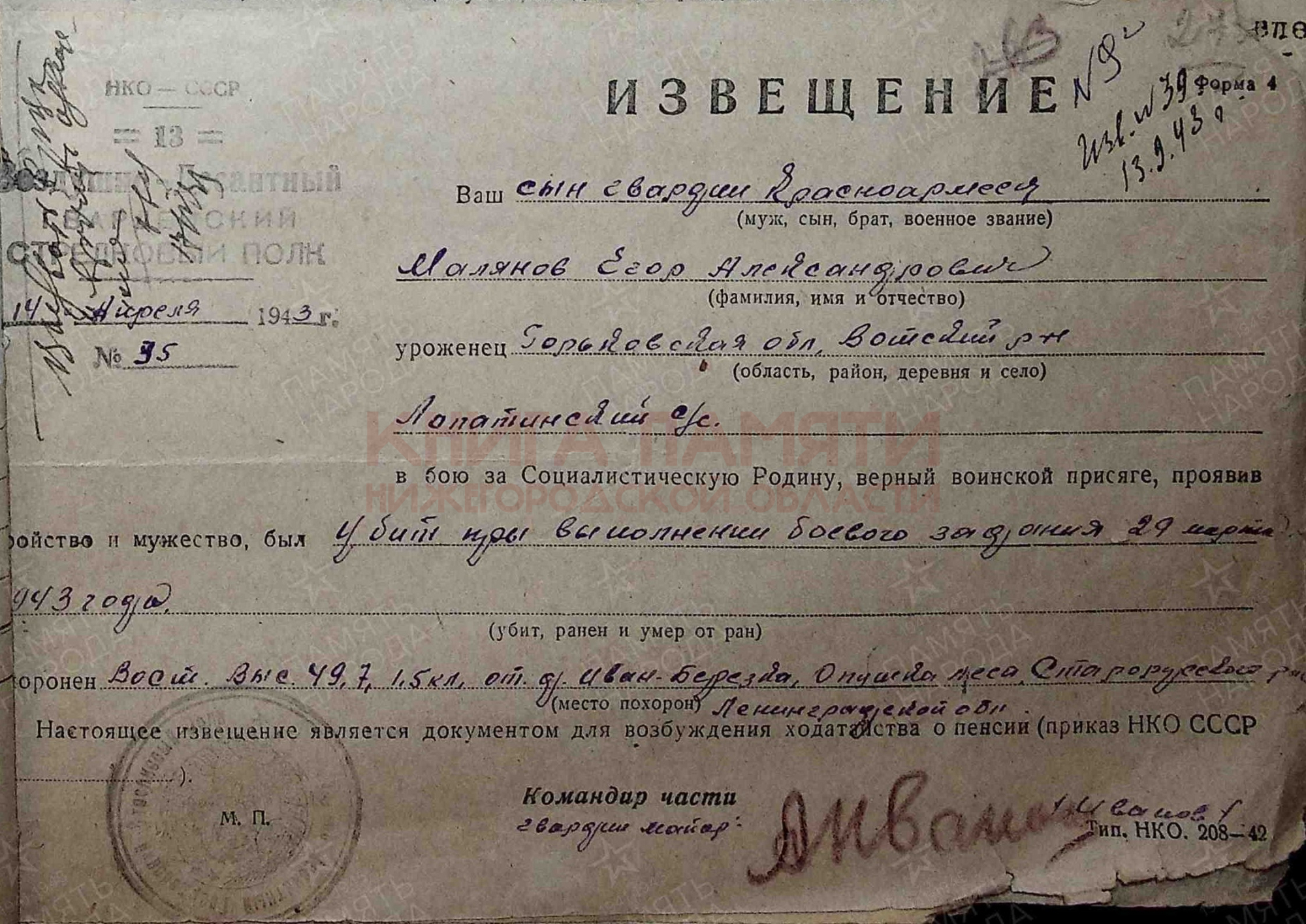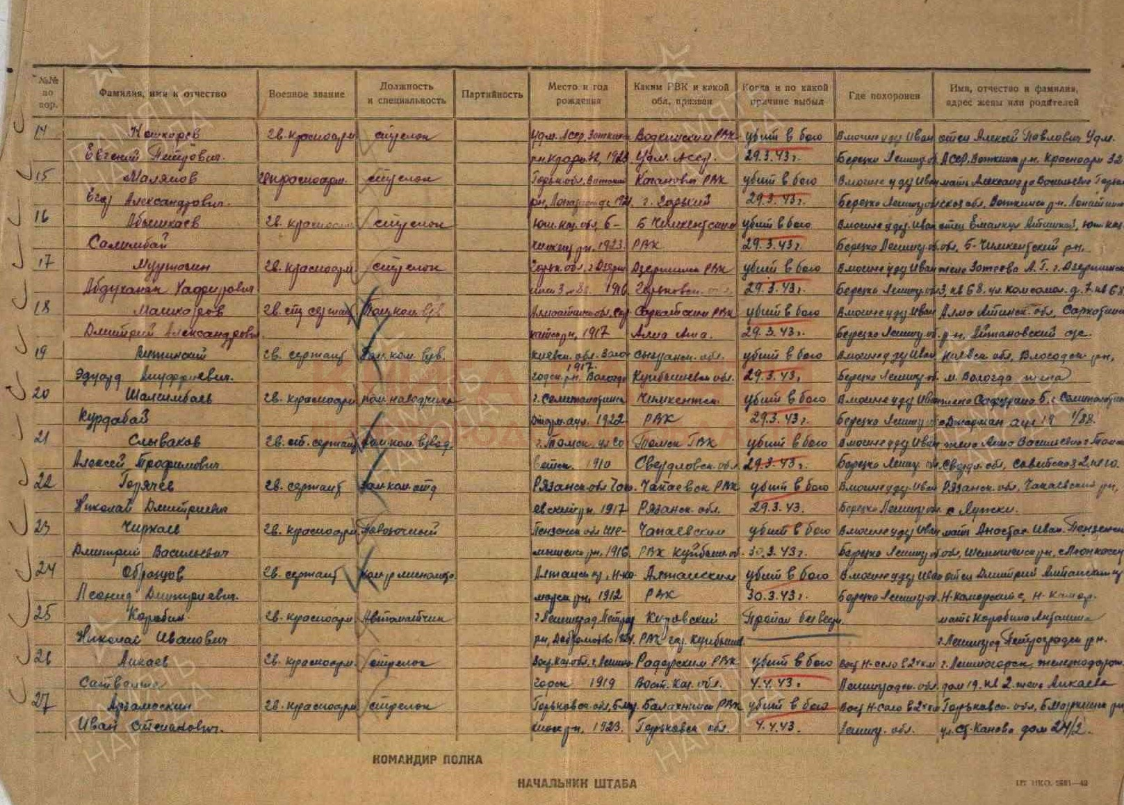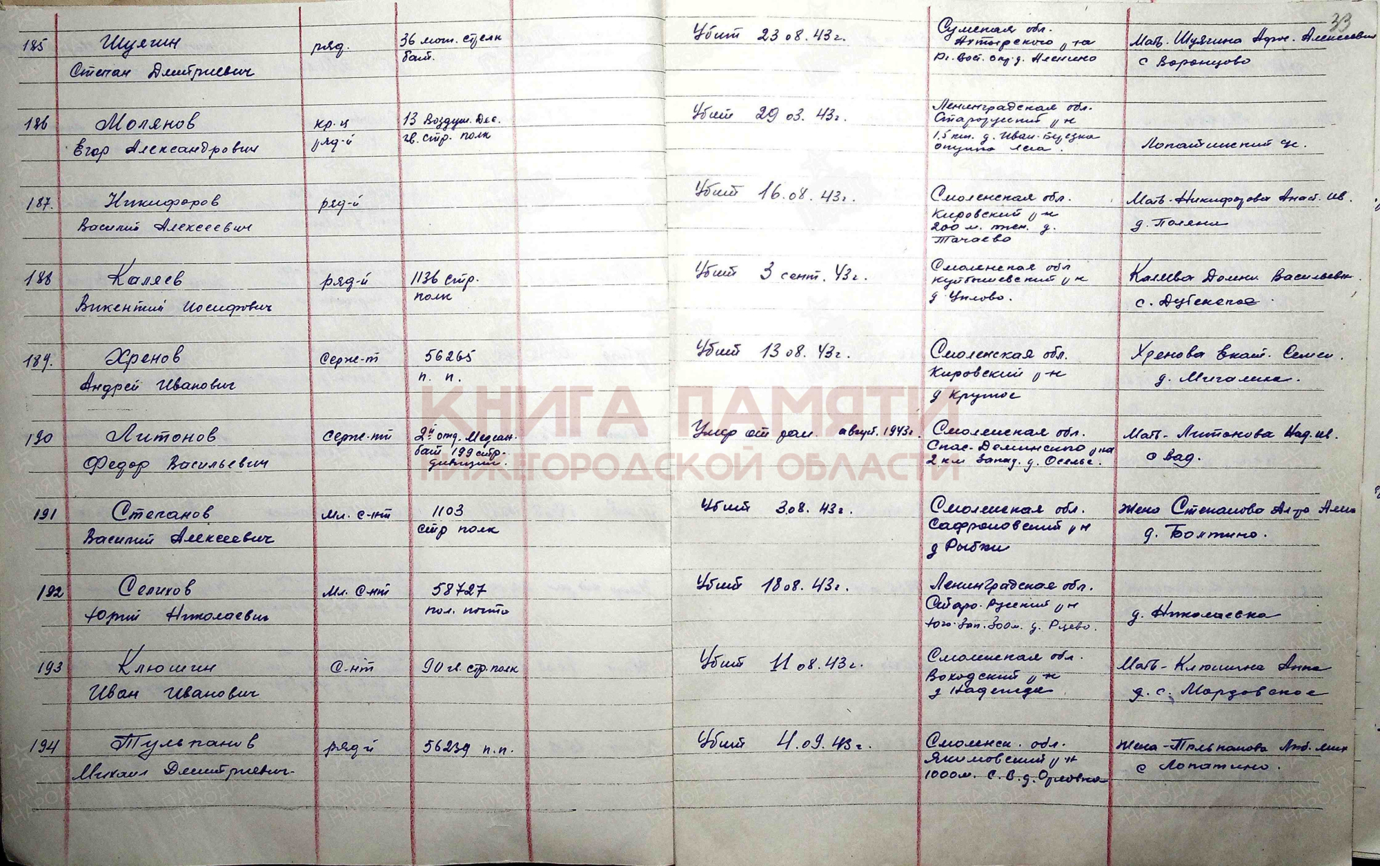 Погиб в бою, 29 марта 1943 г. Место захоронения Новгородская обл., Старорусский р-н, д. Иван-Березка ;