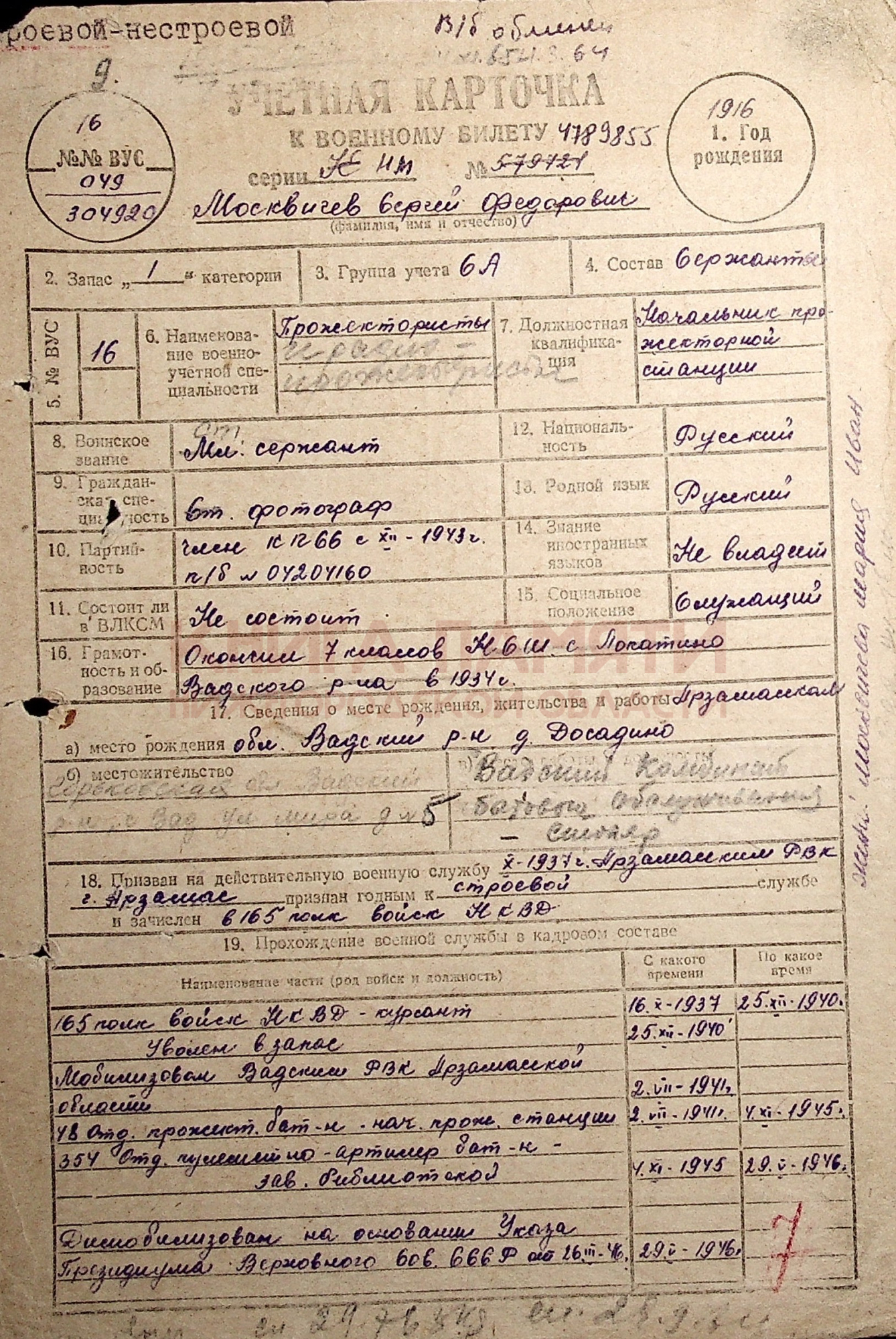 Хорошо помнит Сергей Федорович 22 июня 1911 года. На улицах Вада собирались группами люди и обсуждали это событие. Сам Москвичев пришел в военкомат сразу же после того страшного известия. Когда попросил районного военного комиссара, чтобы его отправили на фронт, не ожидание для себя получил отказ. Пояснили что пока нужен в тылу. При военкомате были организованы курсы, на которых шло обучение бойцов для истребительных батальонов. Они в годы войны занимались уничтожением немецких десантов, а также вражеских шпионов. Так вот на этих курсах Москвичев был инструктором.