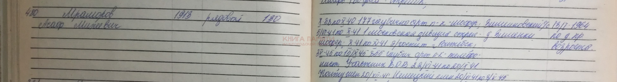 10.1938 - 10.1940 177 гаубично.арт.п-к -шофер, 05.06.1941 -10.1941 1 Московская дивизия стрелок шофер, 10.1941 - 11.1941 э/госпит.г.Витебск, 03.05.1945 -15.10.1945 855 гаубично арт.п-к -телефонист.Участник ВОВ 22.06.1941 - 20.10.1941.Контужен 20.12.1941. Немецкий плен 20.11.1941 -03.05.1945