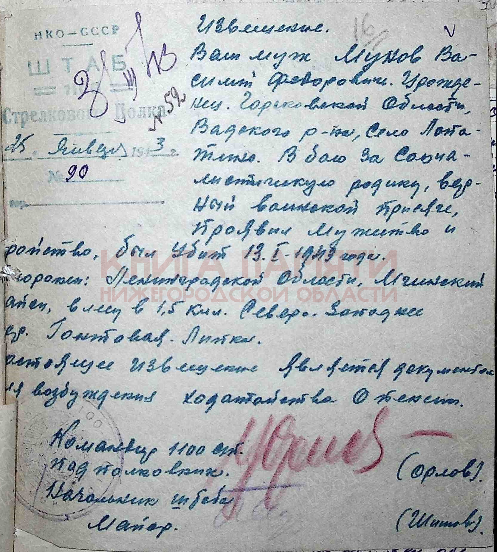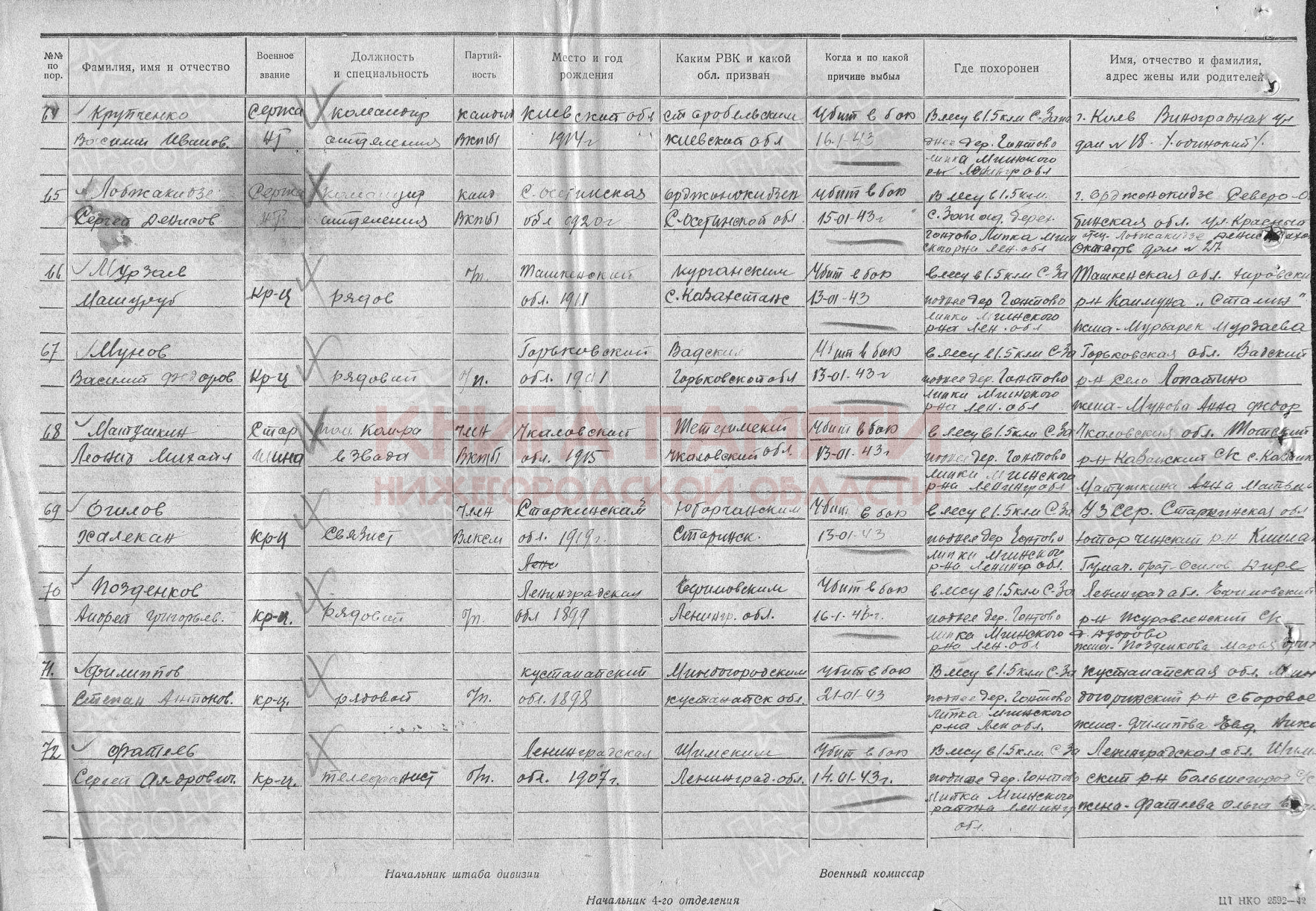 Погиб в бою 13 января 1943 г Место захоронения Ленинградская обл., Мгинский р-н, д. Гонтовая Липка, северо-западнее, 1500 м, лес