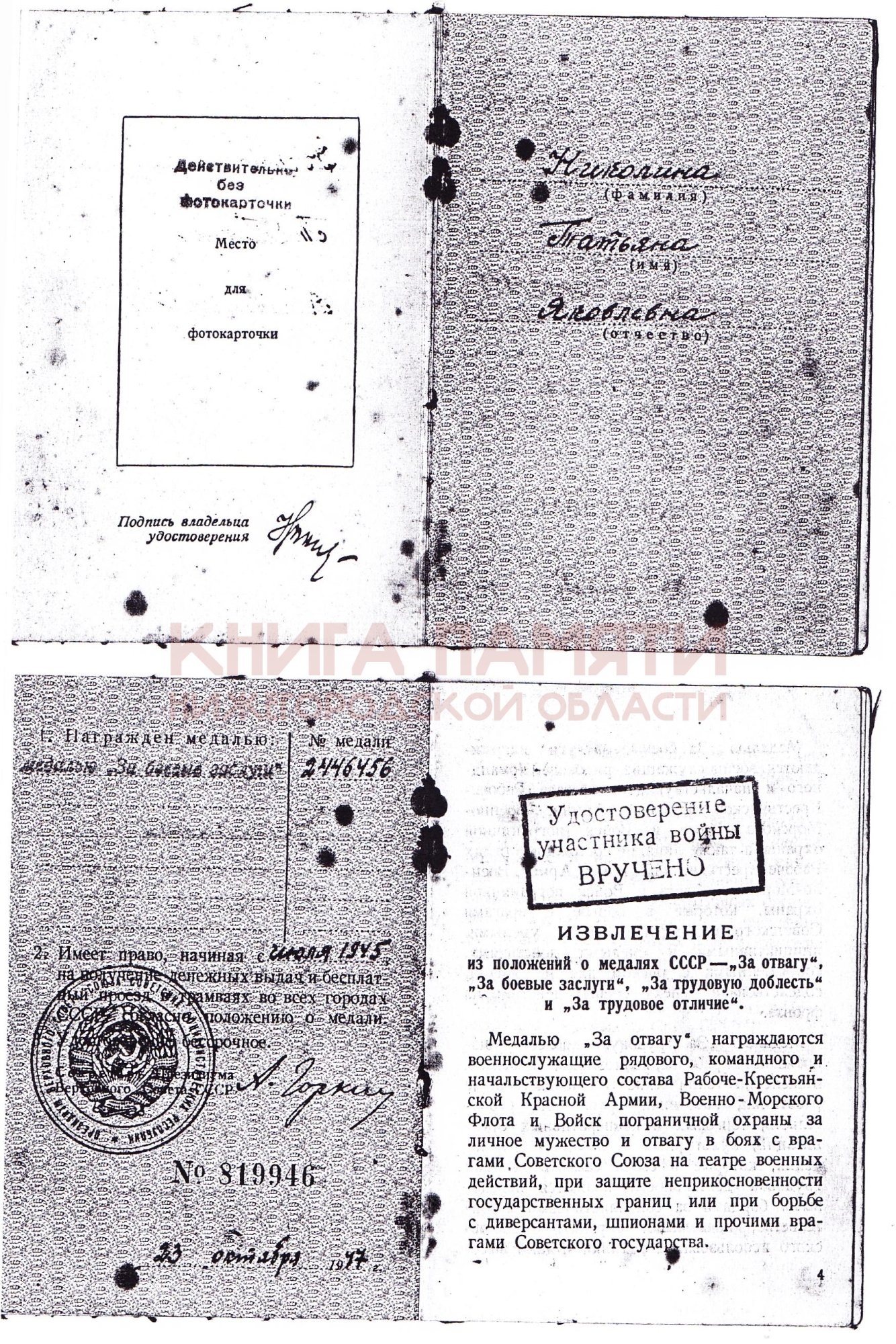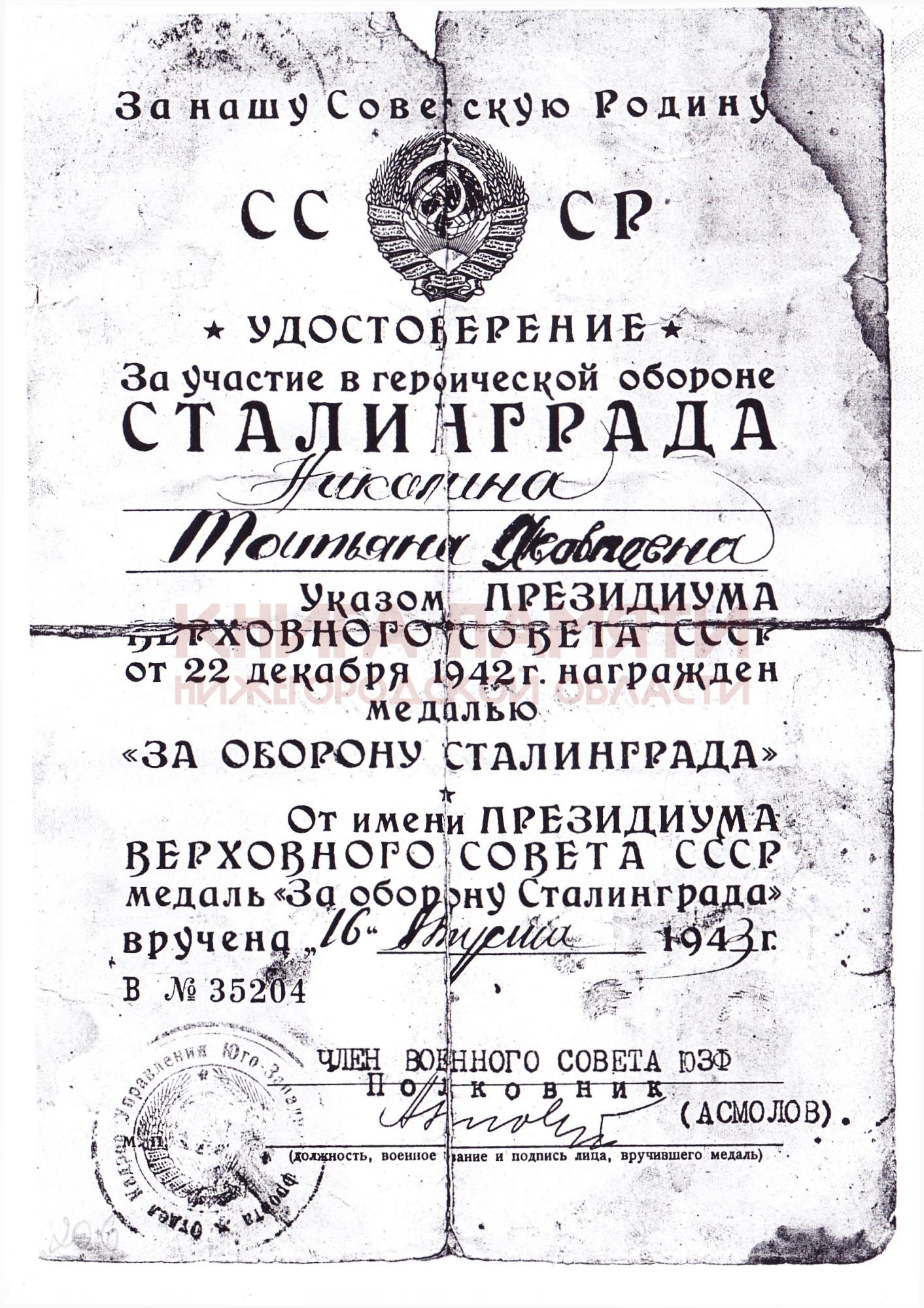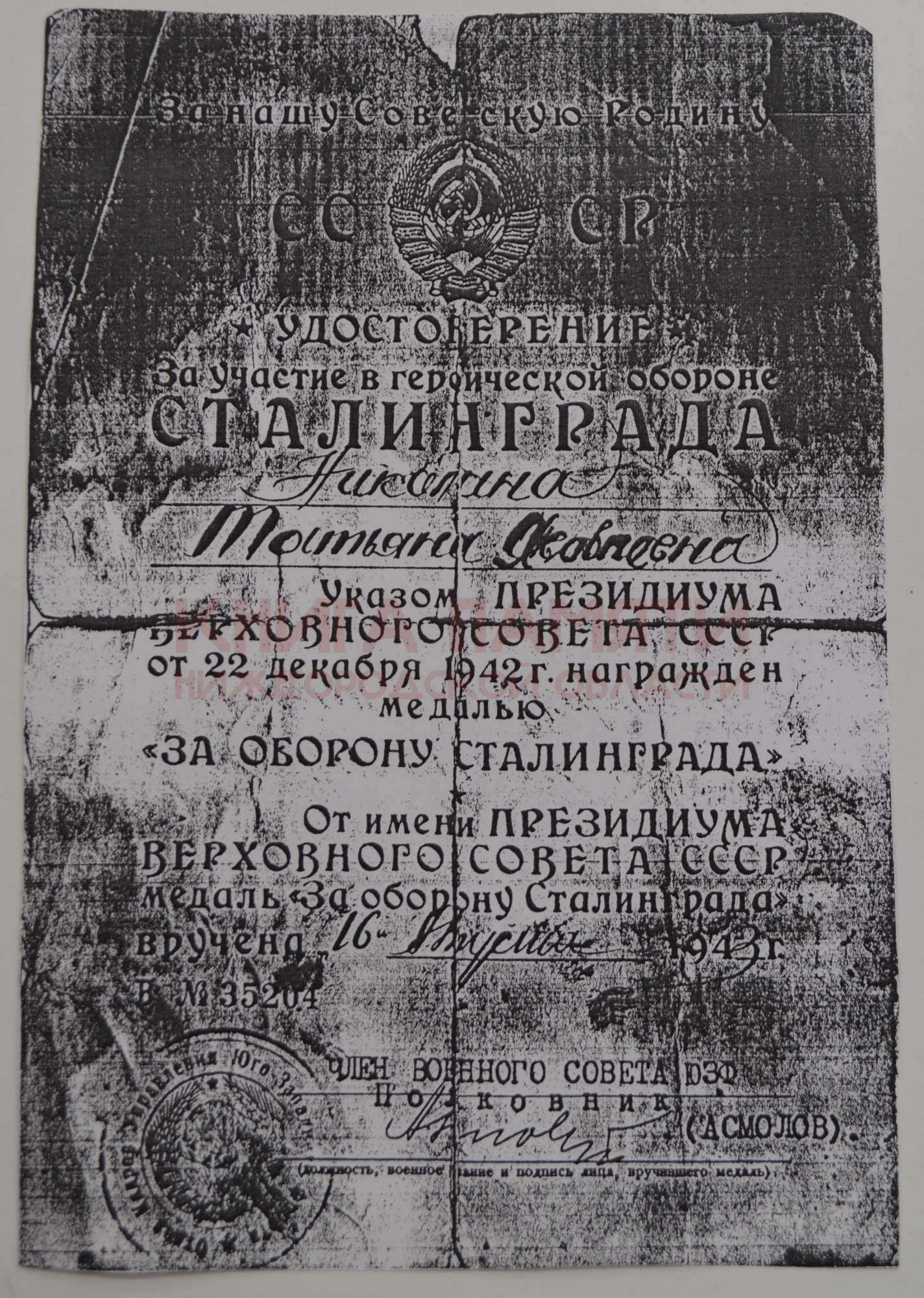 Медаль «За оборону Сталинграда» была её первый боевой наградой. Потом были Будапешт, Прага... И медали за их освобождение. Пройдены Чехословакия, Венгрия, Румыния, Австрия... Медалью «За боевые заслуги» отмечен боевой путь старшего сержанта Татьяны Яковлевны Николиной.