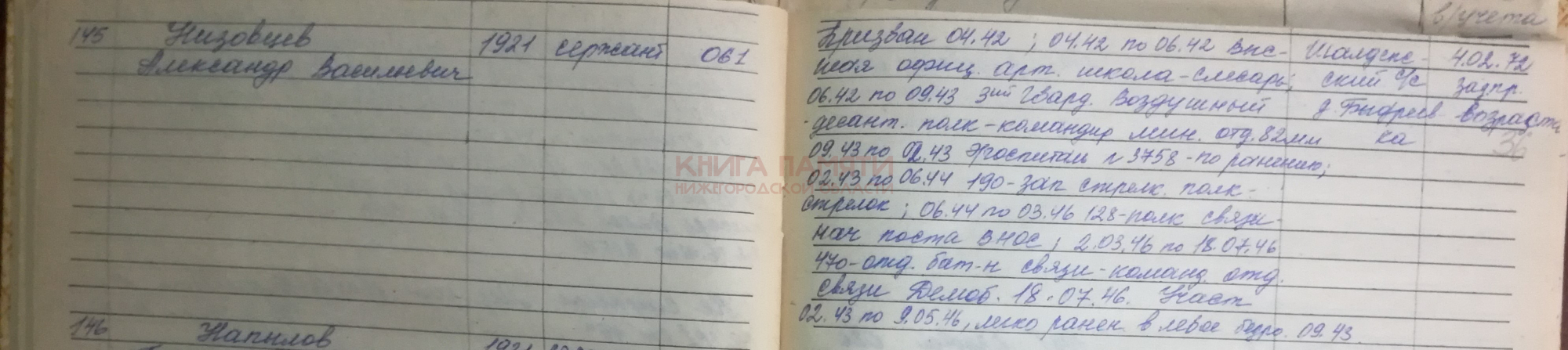 04.1942 - 06.1942 высшая офиц.арт.школа -слесарь, 06.1942 - 09.1943 3ий гвард.воздушный десант.полк -командир мин.отд.82 мм, 09.1943 - 1943 э/госпиталь № 3758 - по ранению , 02.1943 -06.1944 -190 зап.стрелк.полк - стрелок, 06.1944 -03.1946 128 полк связи нач.поста ВНОС,02.03.1946 -18.07.1946 -470 отд.б-н связи -командир отд.связи. Участник 02.1943 - 09.05.1946.