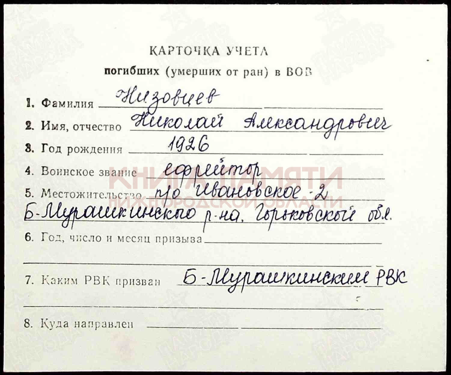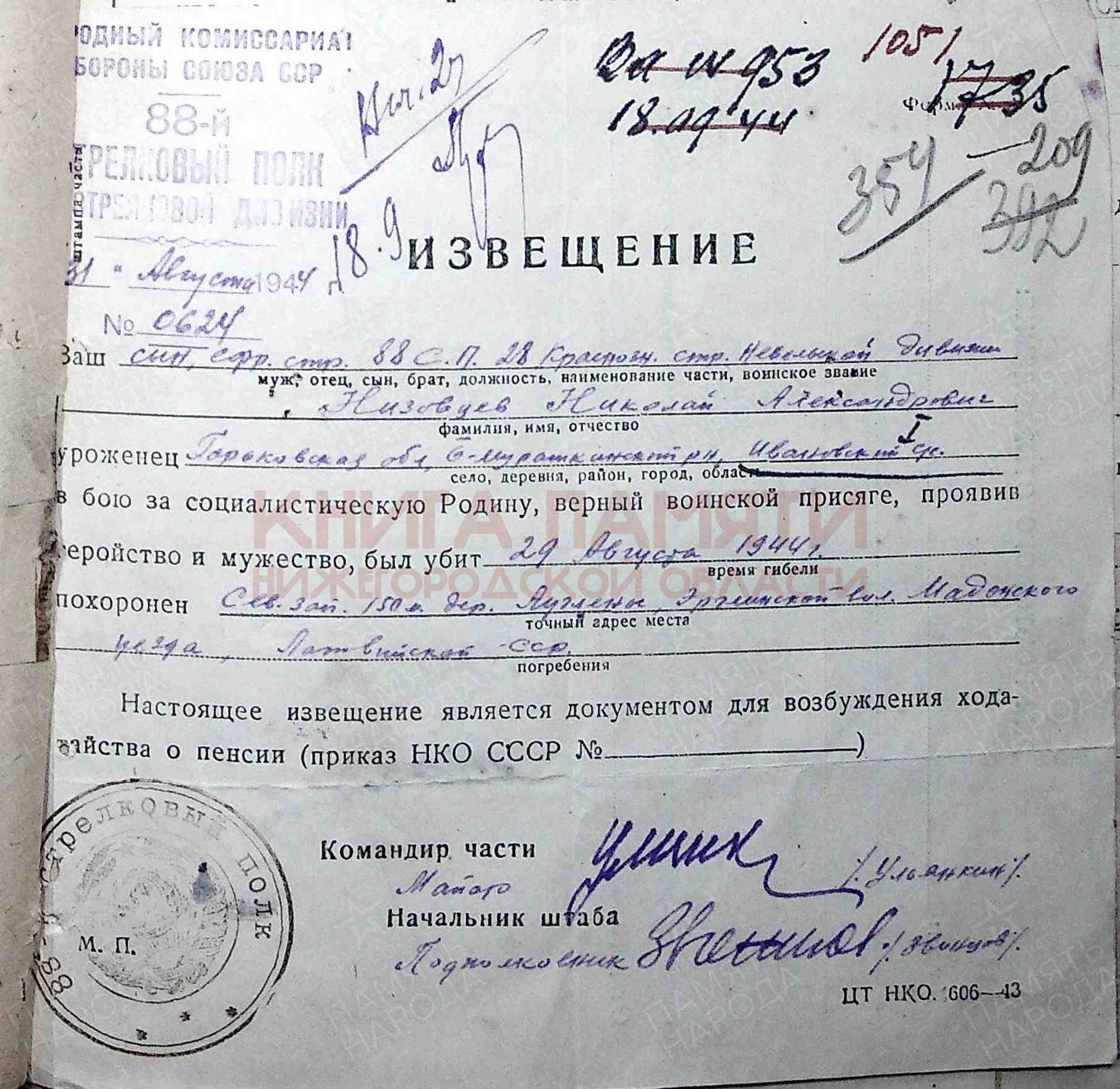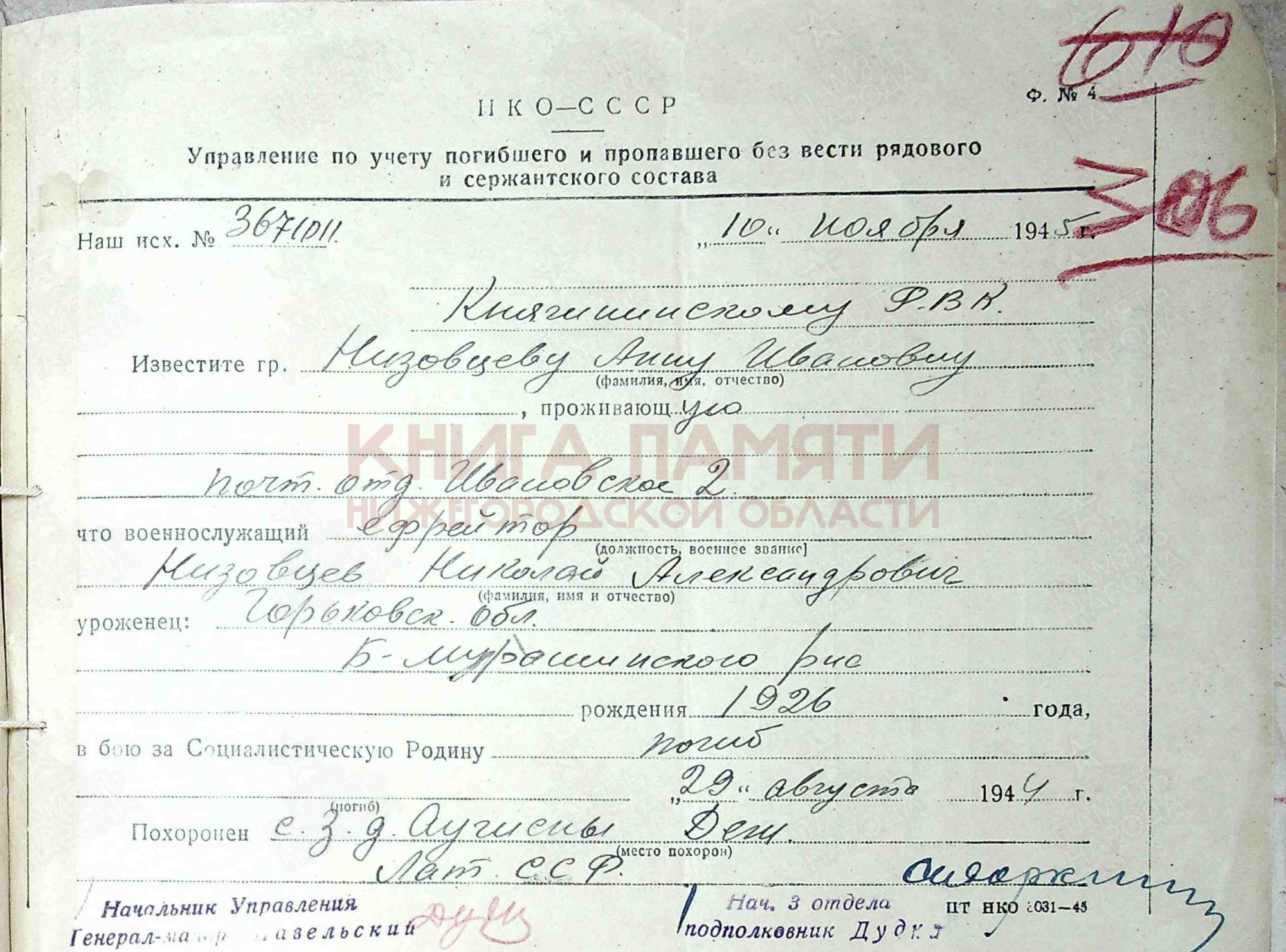 Погиб в бою 29.08.1944. Похоронен в Латвии Мадонский уезд, Эрглинская вол., д. Ауглены, северо-западнее, 150 м