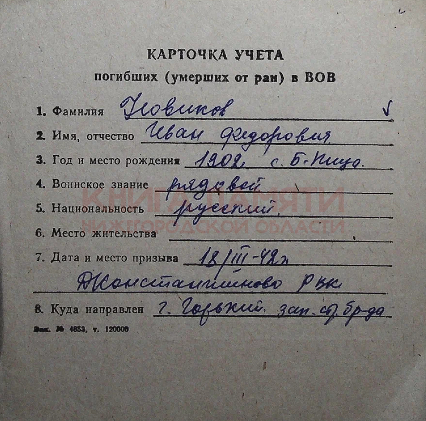 Уроженец села Большая Пица Дальнеконстантиновского р-на. Был призван на фронт 18.03.1942г. Служил рядовым солдатом в составе запасной строительной бригады. Погиб 21.07.1944г. Похоронен в Ленинградской обл. Жена Новикова Любовь Васильевна проживала в селе Большая Пица.