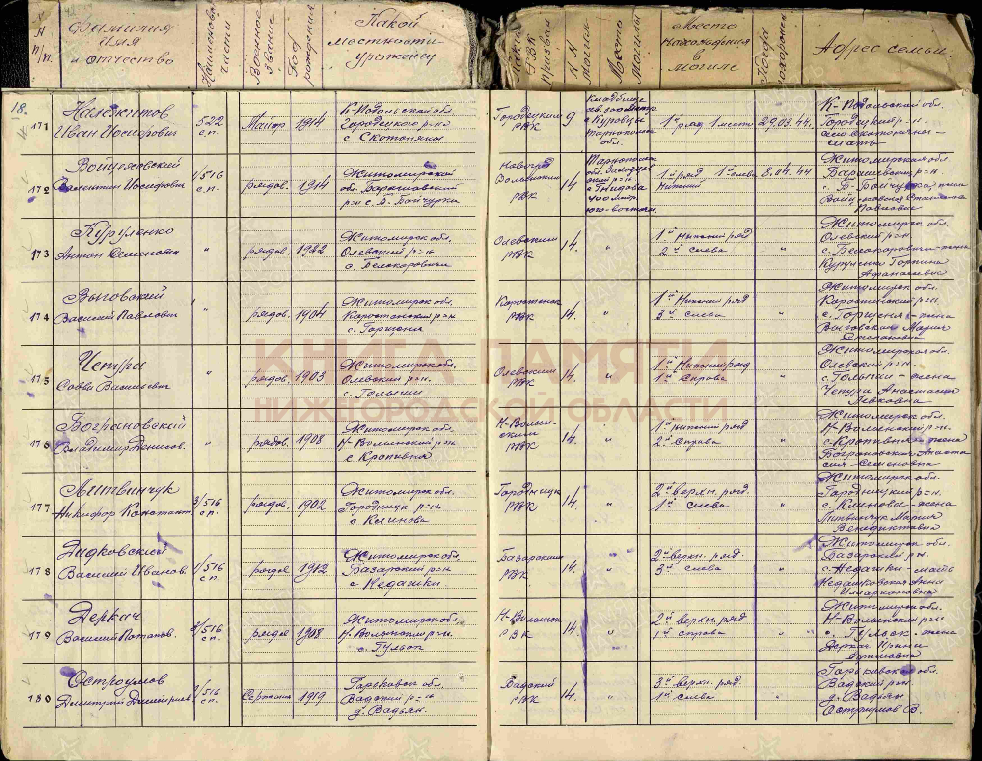Место захоронения: Украинская ССР, Тарнопольская обл., Збаражский р-н, с. Гнидово, юго-восточнее, 400 м, могила № 14, 3 верхний ряд, слева 1; Украинская ССР, Тарнопольская обл., Зборовский р-н, с. Воробьевка, 50 м, юго-восточная окраина