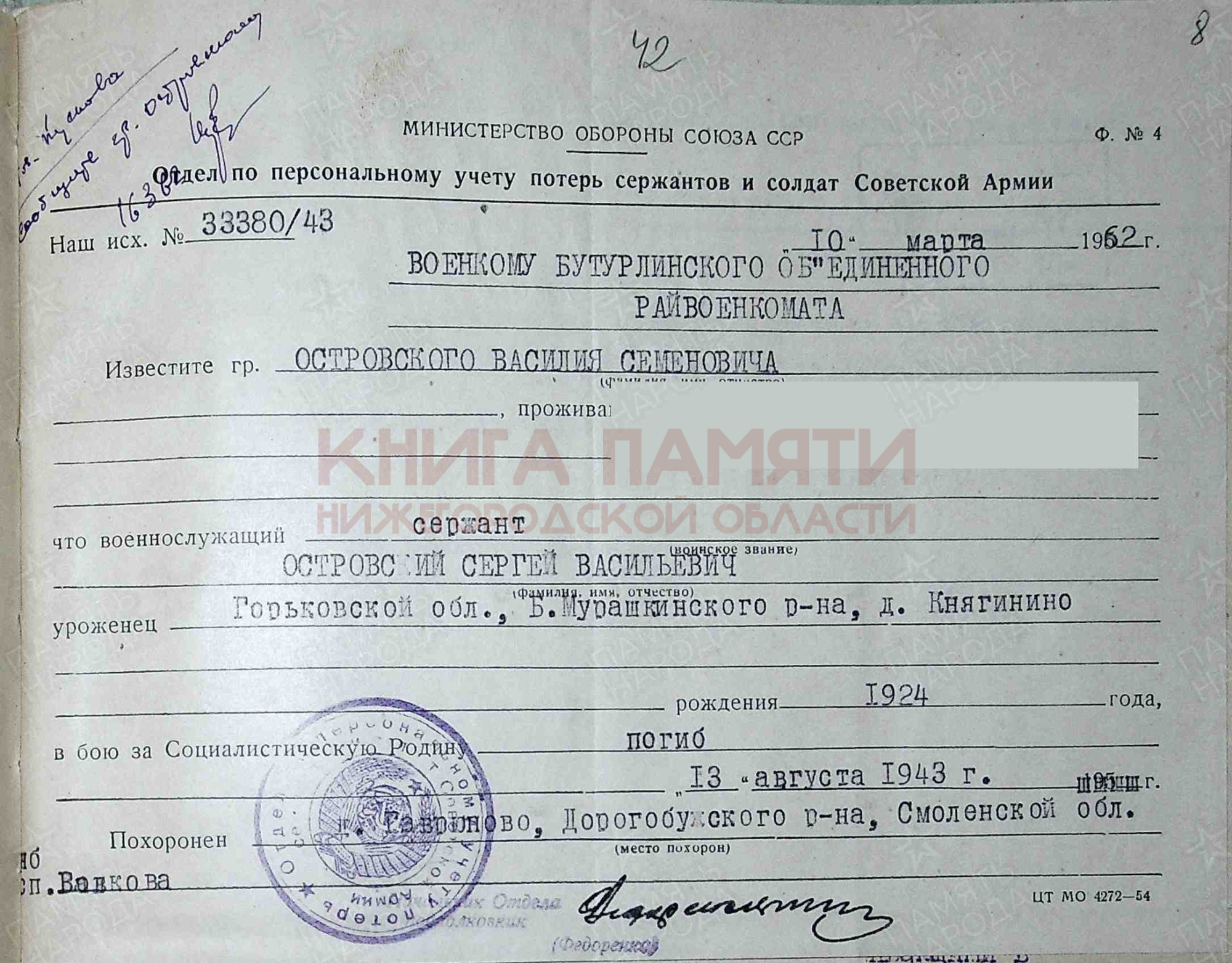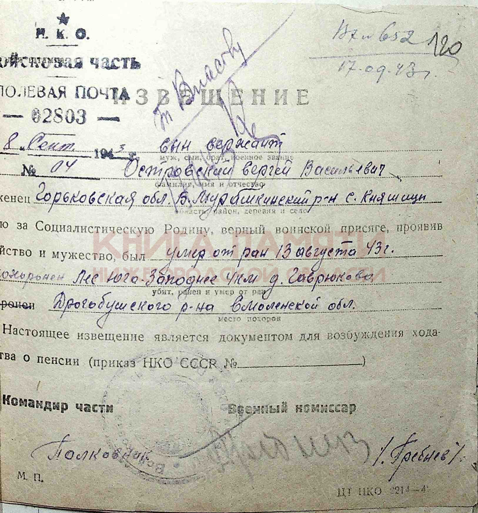 Похоронен в деревне Гаврюково Дорогобужского района Смоленской области.