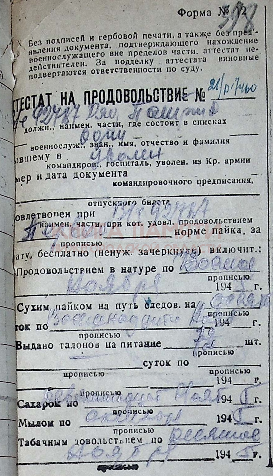 Демобидизован в 1945 г.