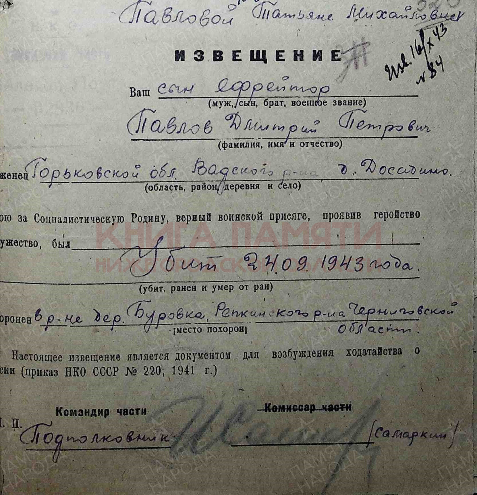 Погиб в бою 24 сентября 1943 г.