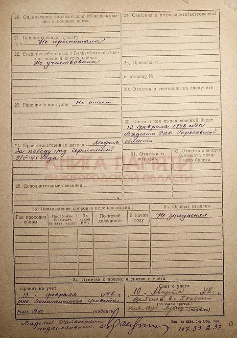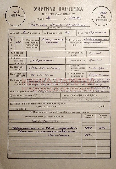 В 1945 уволена по расформированию госпиталя.