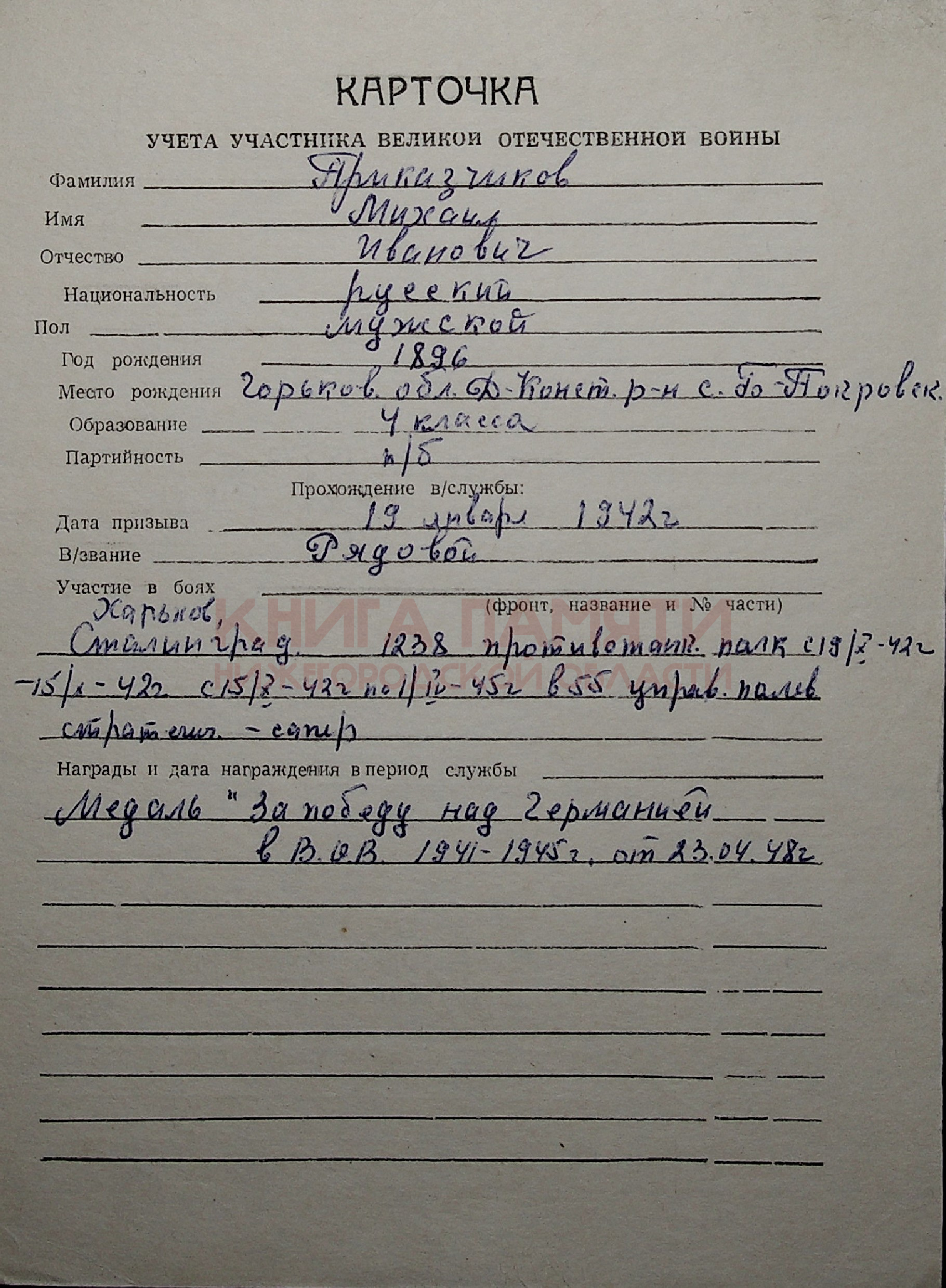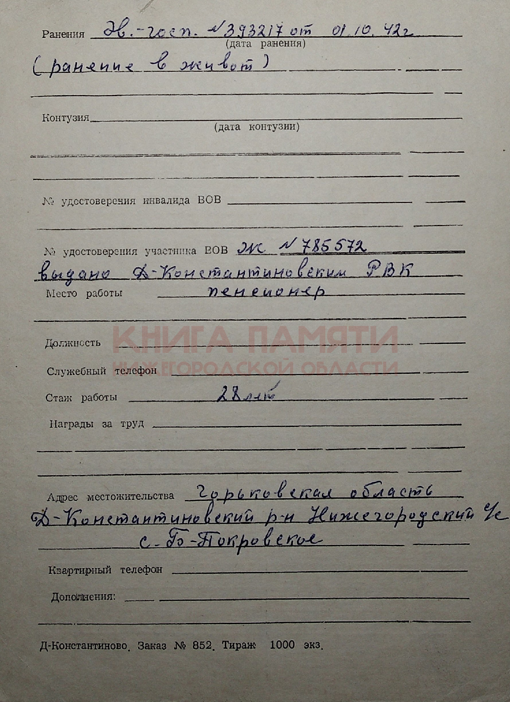 Уроженец с. Б-Покровское, с 5/Х-36 по 23/II-37 работал счетоводом на Чернухинском заводе Зелецинского заводоуправления Кстовского р-на, с 28.02.1937г.по апрель 1940г., затем до января 1942г. работал бухгалтером в артели "Сетка". Был призван на фронт, участвовал в боях за Сталинград, в октябре 1942г. был ранен и находился в эв.госпитале №393217. Служил в армии с 1915г. по 1918г. в Красной Армии с 15 января 1919г. по 25 ноября 1921г. Проходил службу в Советской Армии с 19 января 1942г по 1 августа 1945г.