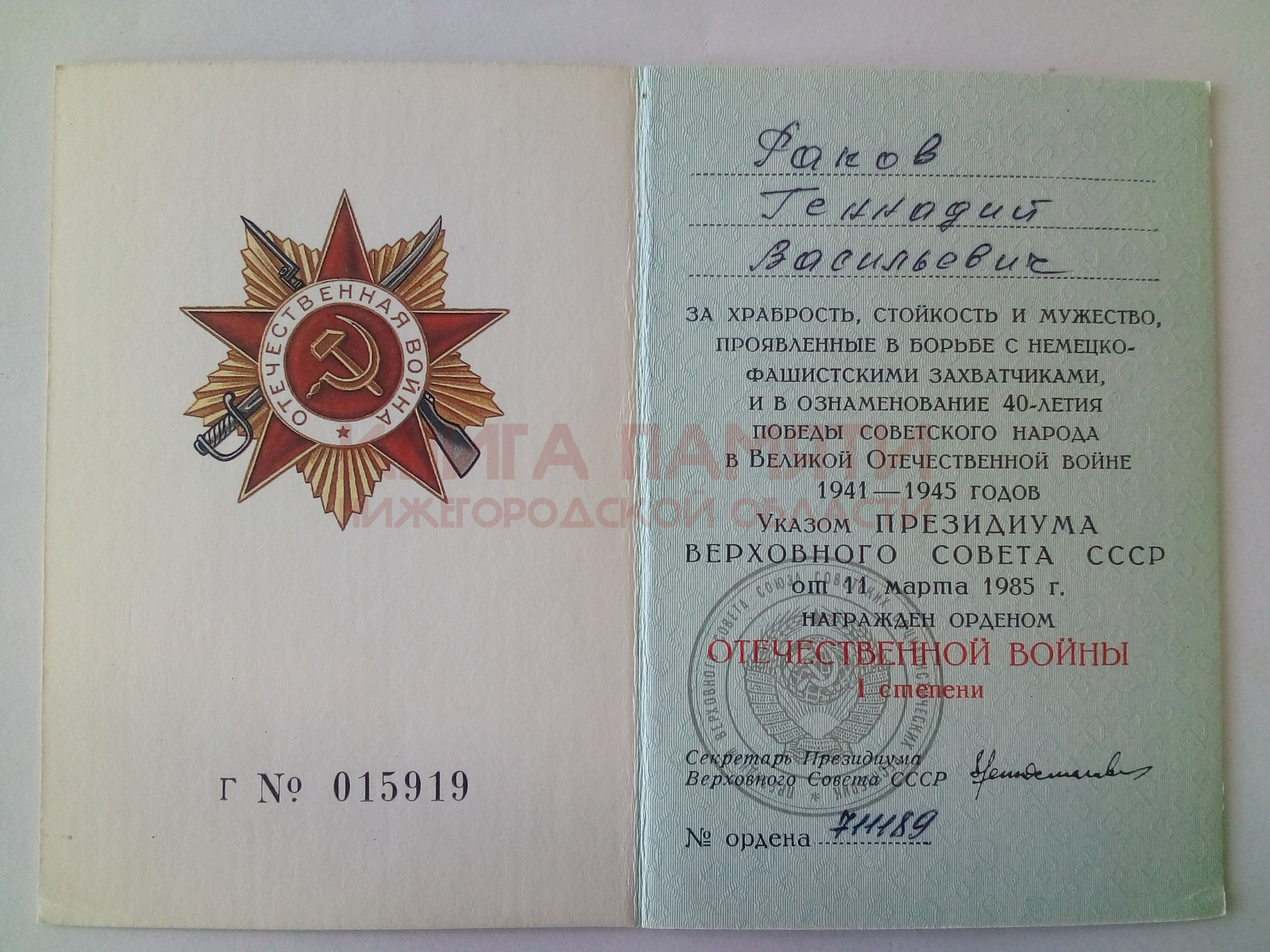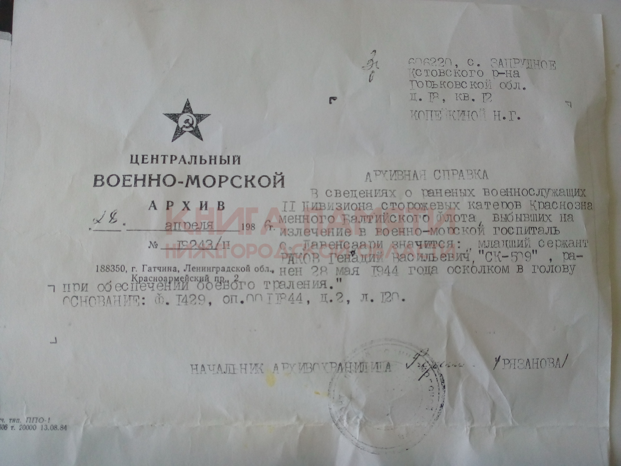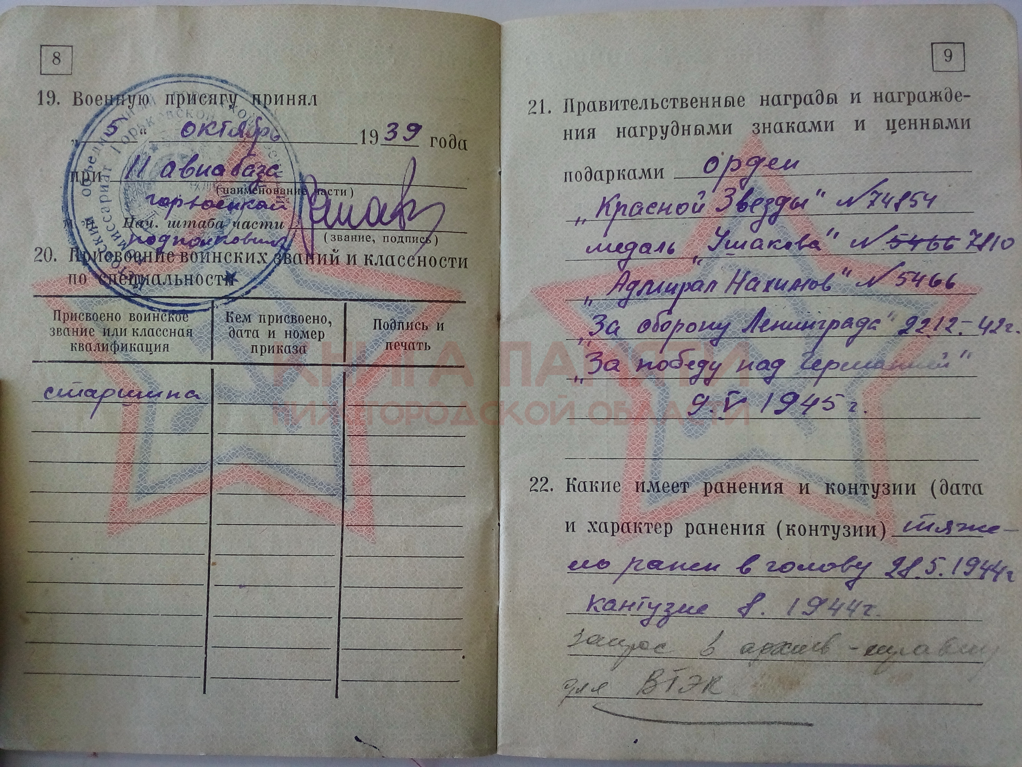 "Орден Красной Звезды"; медали: "За оборону Ленинграда", "Адмирал Ушаков", "Адмирал На имов"