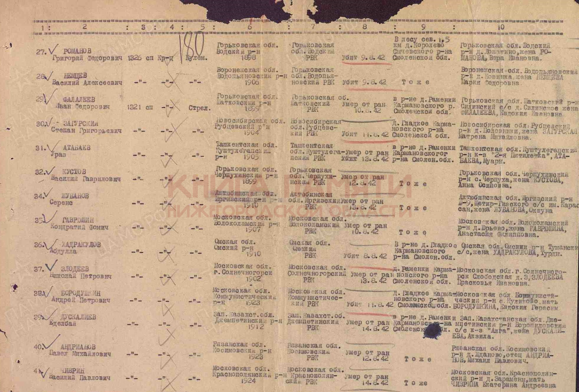 Место захоронения Новодугинский р-н, д. Домашенка, братская могила 10, 1-4 ; Тверская обл., д. Карасево ; Новодугинский р-н, д. Домашенка ; Смоленская обл., Сычевский р-н, д. Королево, севернее, 1500 м, лес ; Калининская обл., д. Королево, около, лес