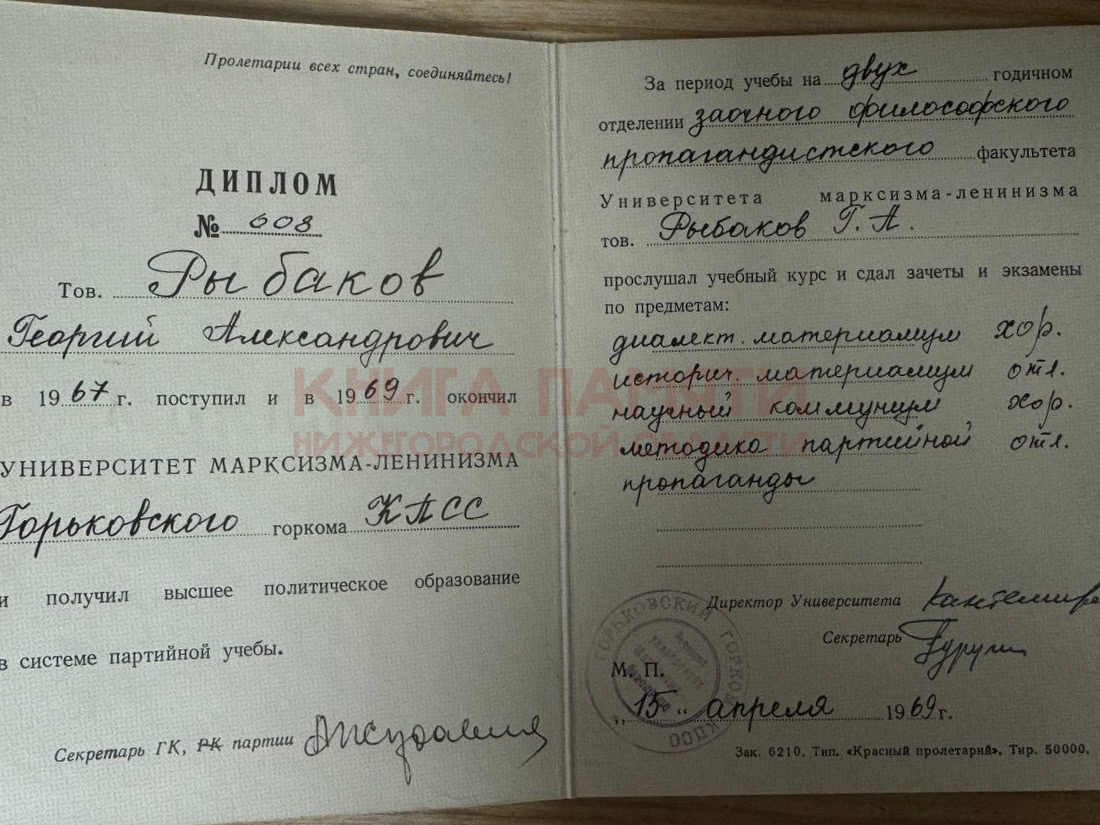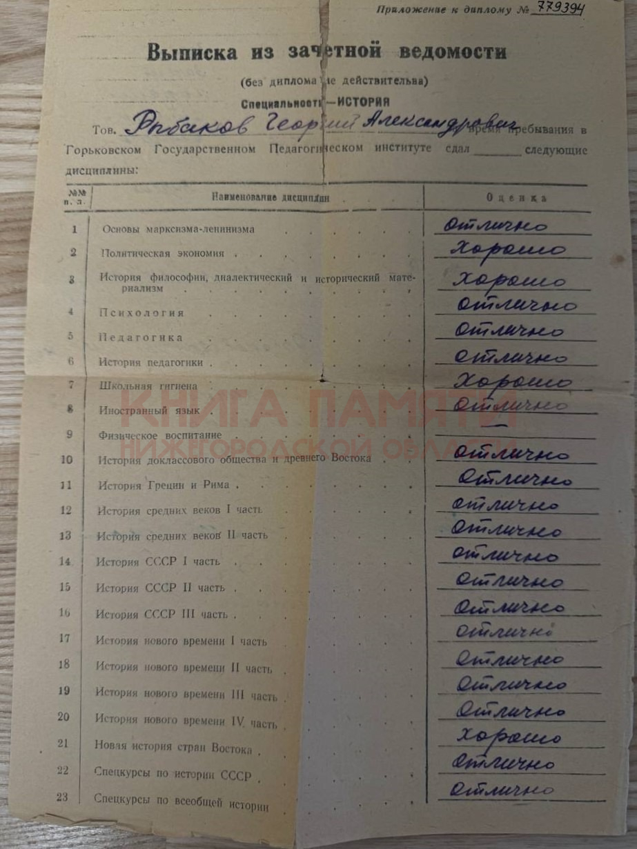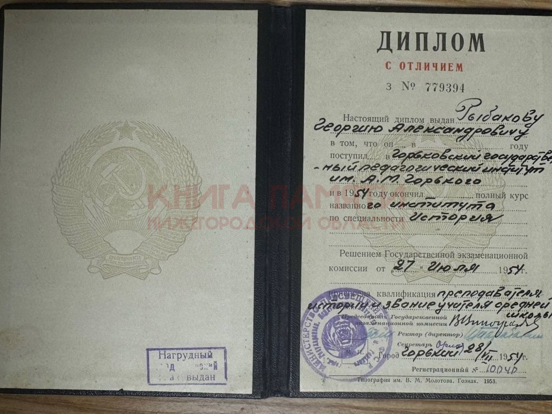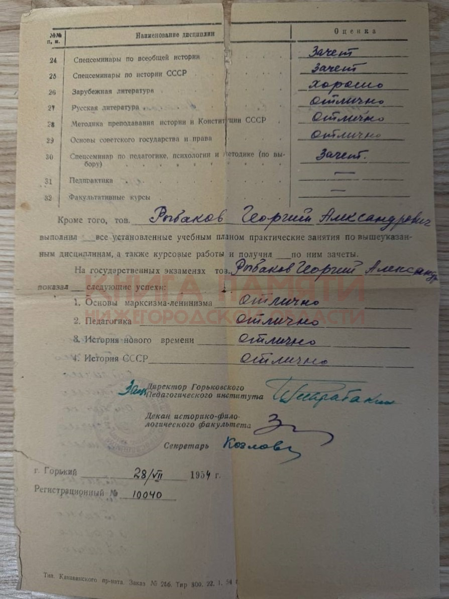 В 1954 году Георгий Александрович окончил Горьковский педагогический институт (заочное отделение) по специальности история. И опять с отличием!!