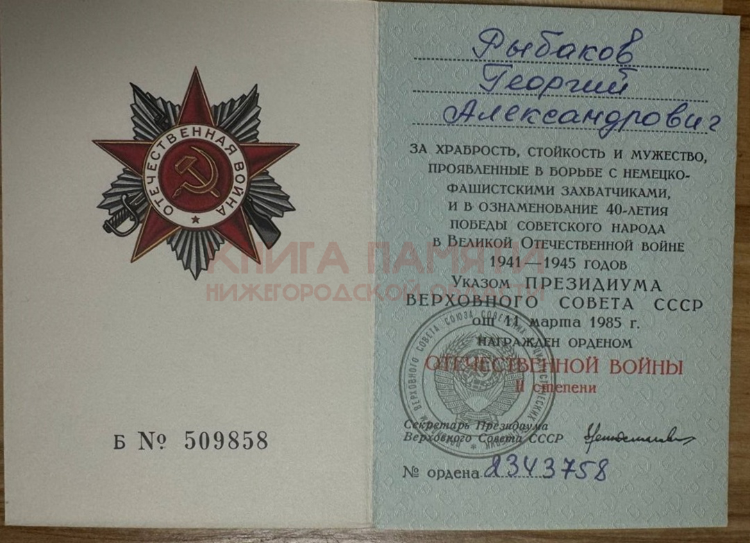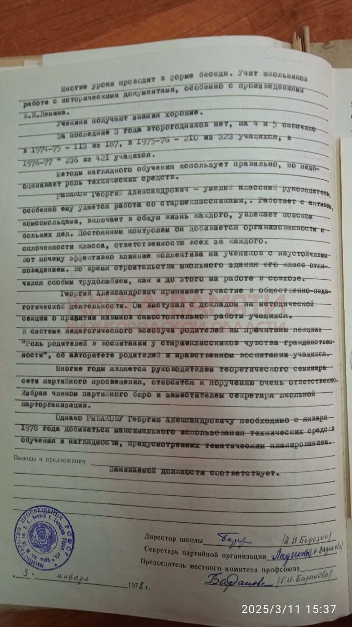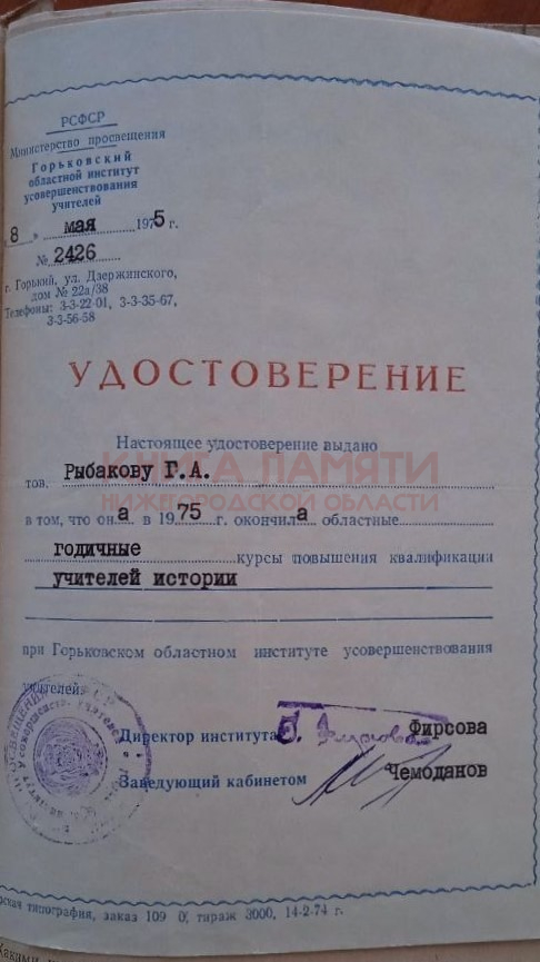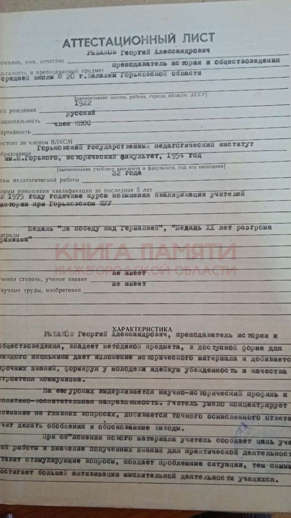 Георгий Александрович Рыбаков преподавателем был просто великолепным, знающим, начитанным. А какой он был рассказчик, как доступно и понятно мог донести до каждого ученика информацию, как умел заинтересовать. Постоянно повышал свой профессиональный уровень: проходил курсы повышения квалификации учителей истории, в 1969 году окончил Университет Марксизма - Ленинизма Горьковского горкома КПСС и получил высшее политическое образование. А еще ходил с учениками в походы, играл в волейбол, очень любил прогулки на лыжах, отлично плавал.