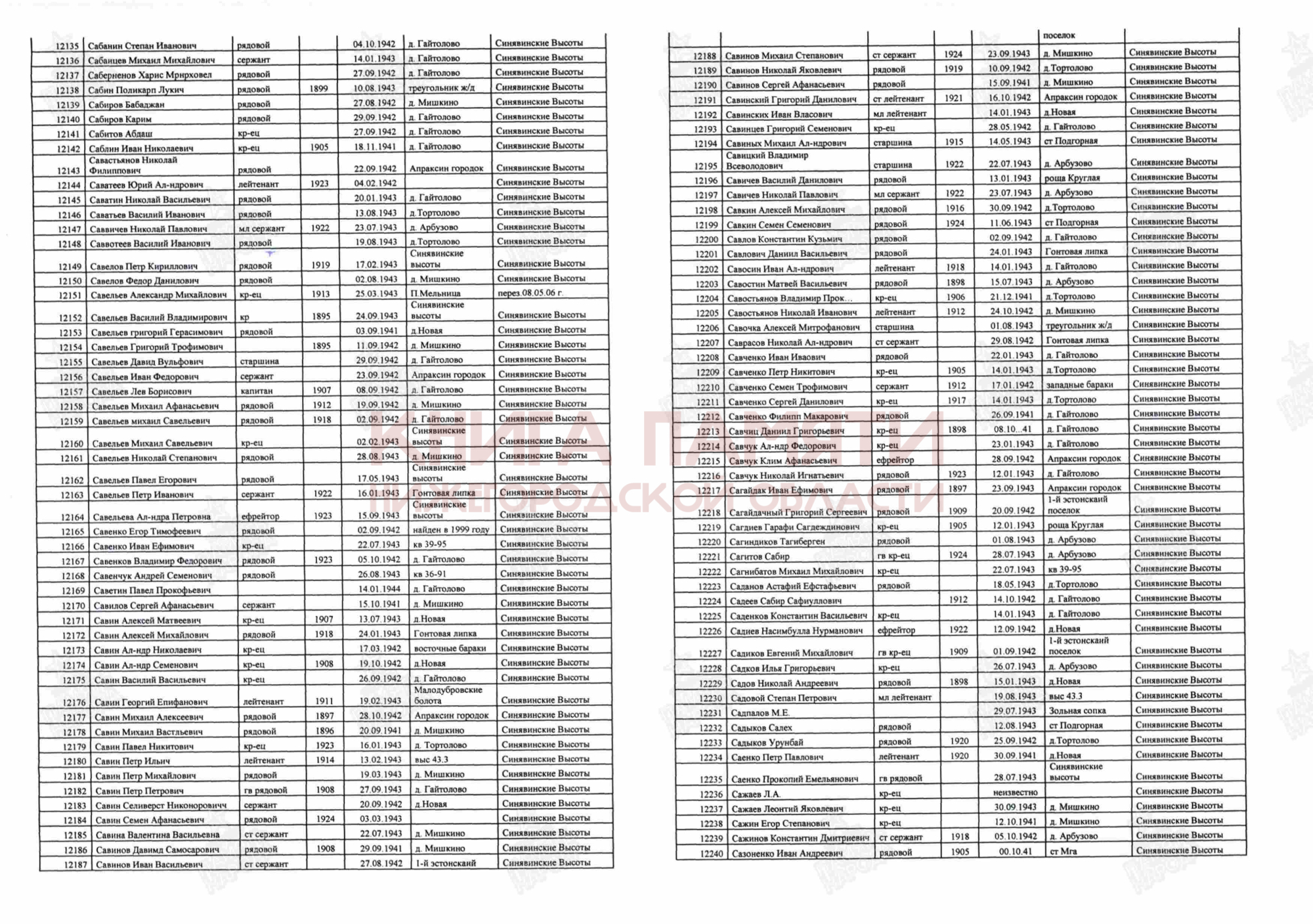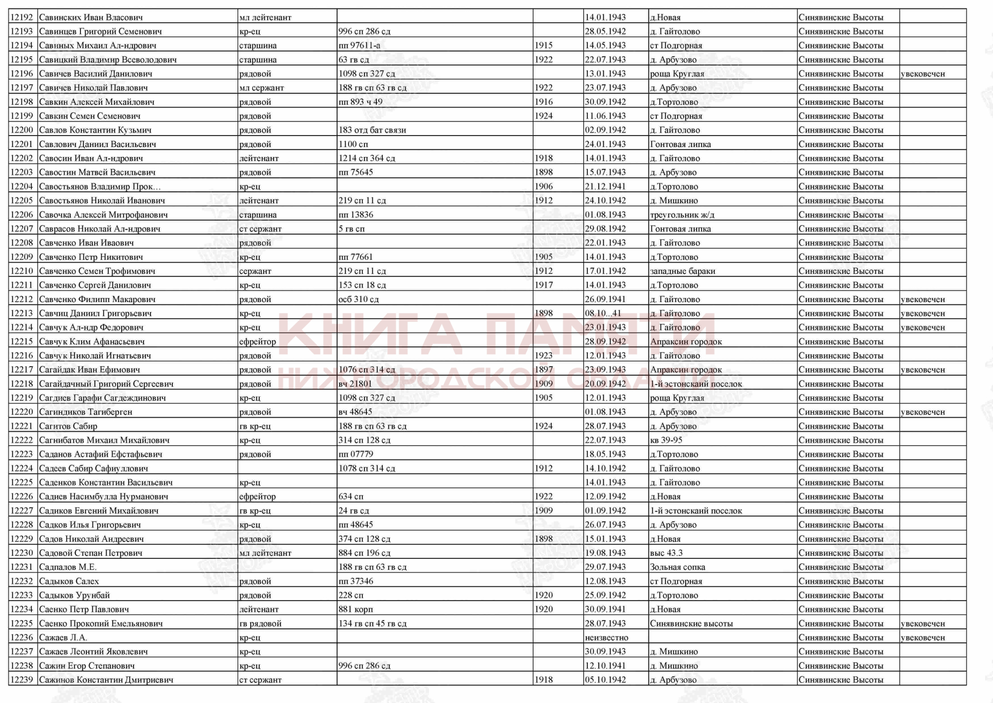 Похоронен Кировский р-н, п. Синявино-1, ул. Песочная, 8 км к востоку, мемориальный комплекс "Синявинские Высоты" ;