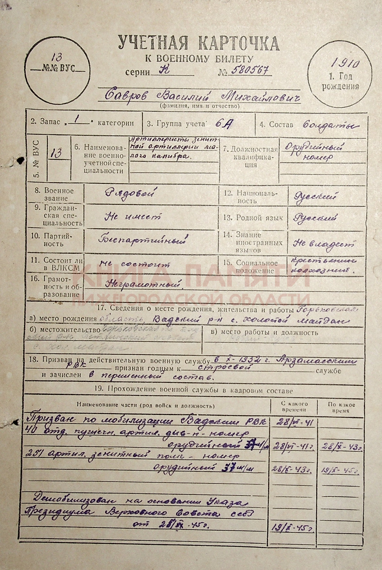 Демобилизован 19.10.1945 г.