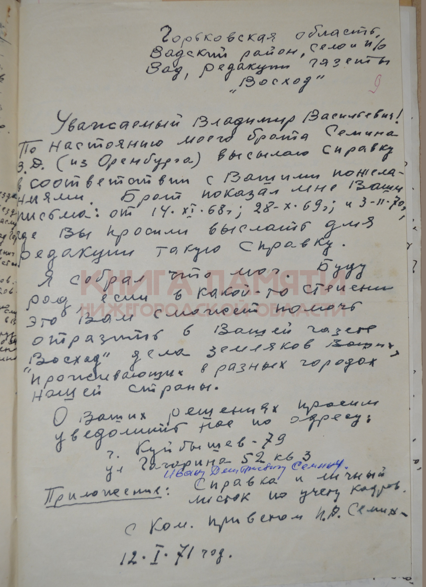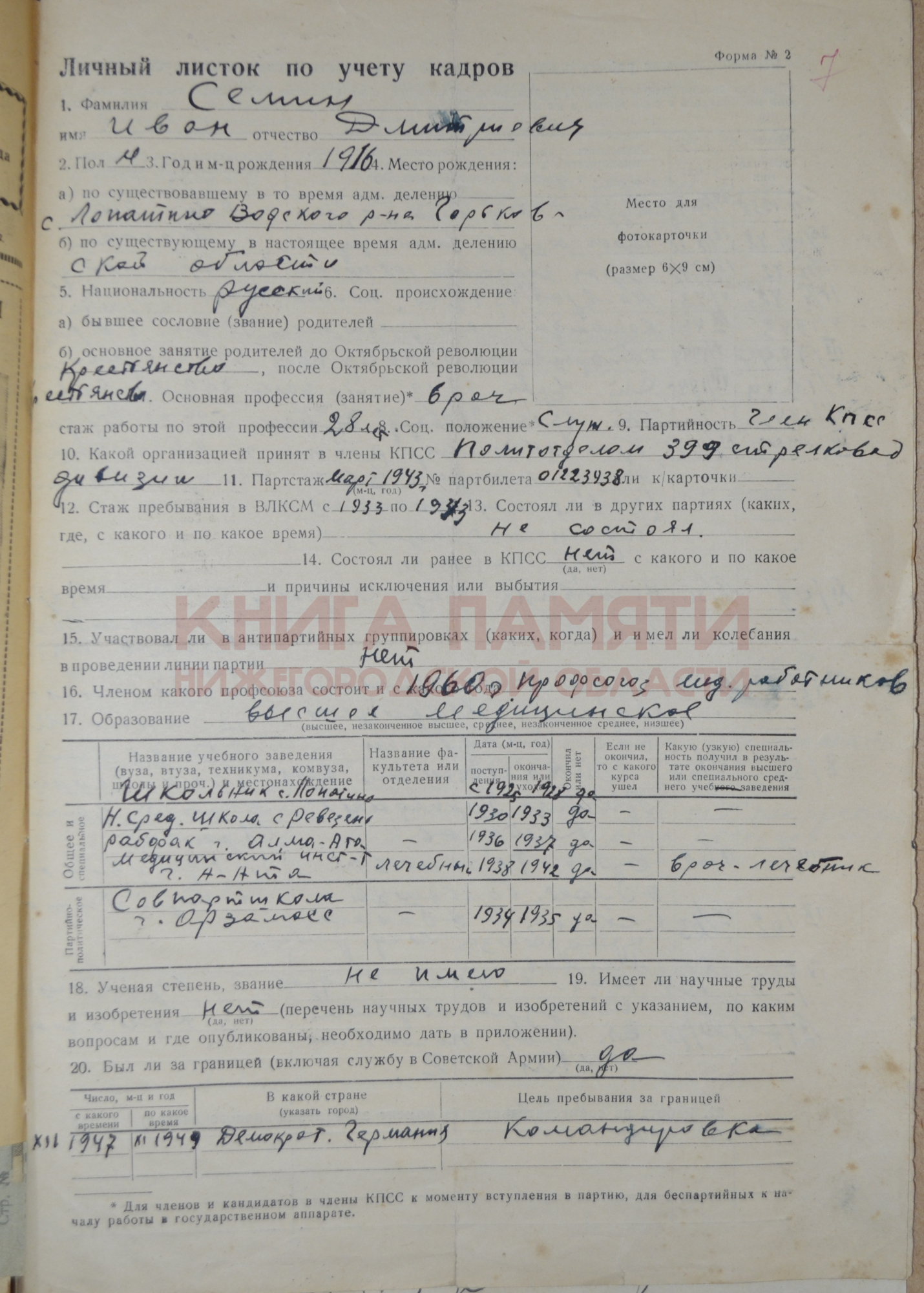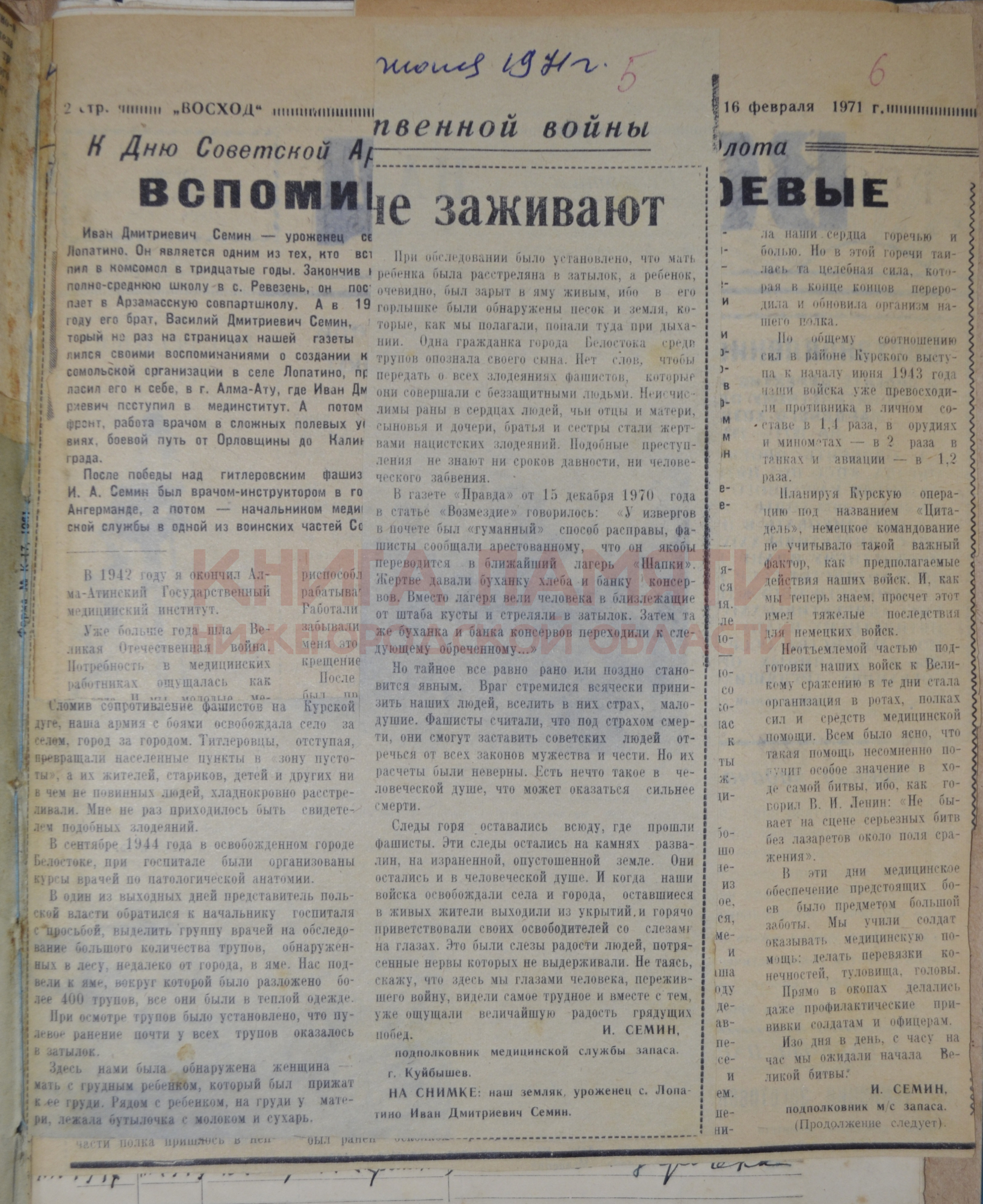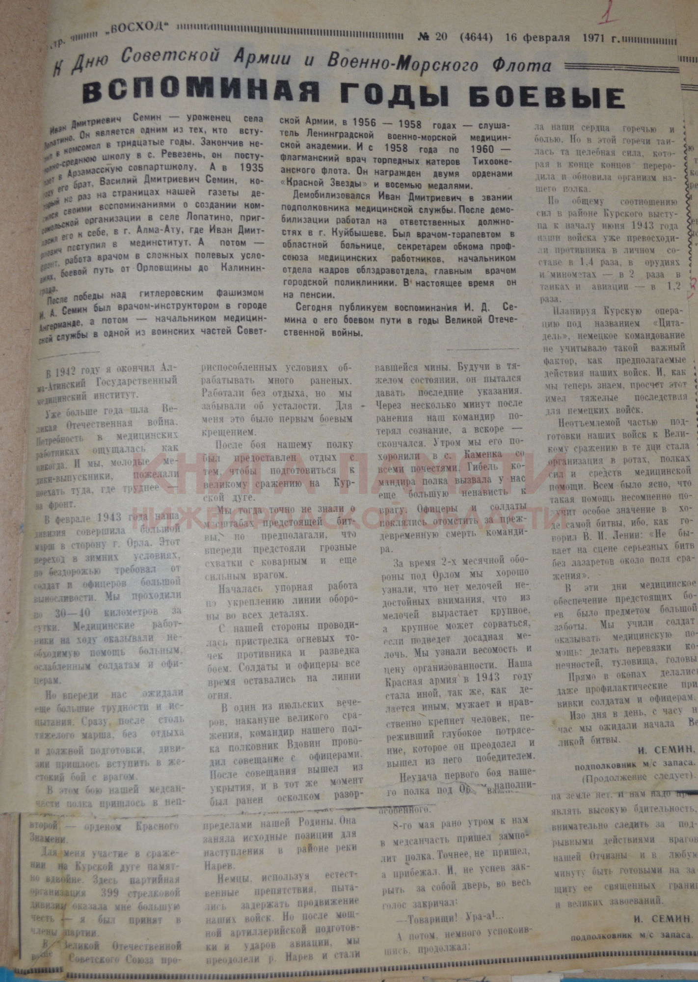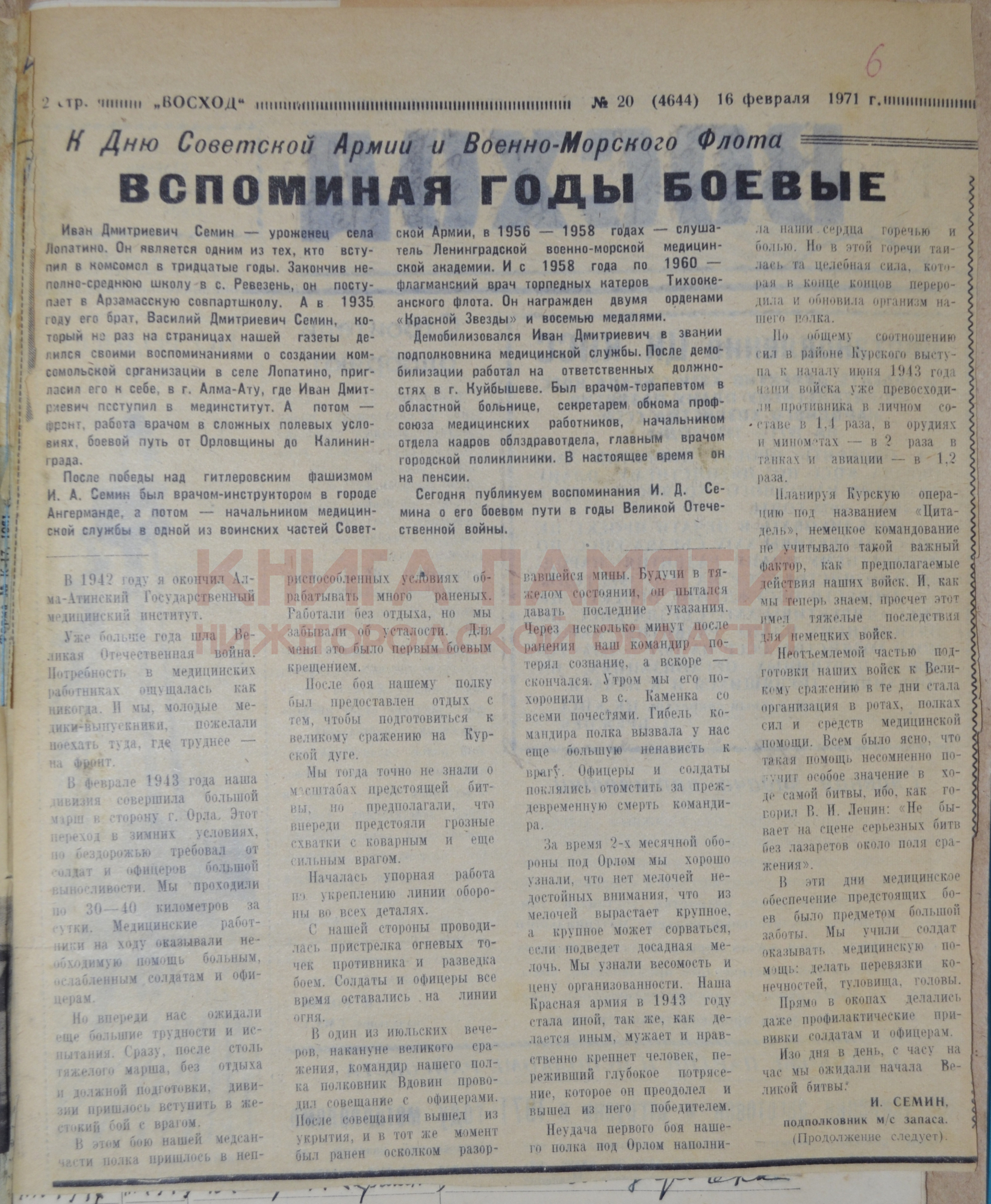 Иван Дмитриевич Семин - уроженец села Лопатино. Он является одним из тех, кто вступил в комсомол в тридцатые годы. Закончив неполно-среднюю школу в с. Ревезень, он поступает в Арзамасскую совпартшколу. А в 1935 году его брат, Василий Дмитриевич Семян, который не раз на страницах нашей газеты делился своими воспоминаниями о создании комсомольской организации в селе Лопатино, пригласил его к себе, в город Алма-Ату, где Иван Дмитриевич поступил в мединститут. А потом - фронт, работа врачом в сложных полевых условиях, боевой путь от Орловщины до Калининграда.