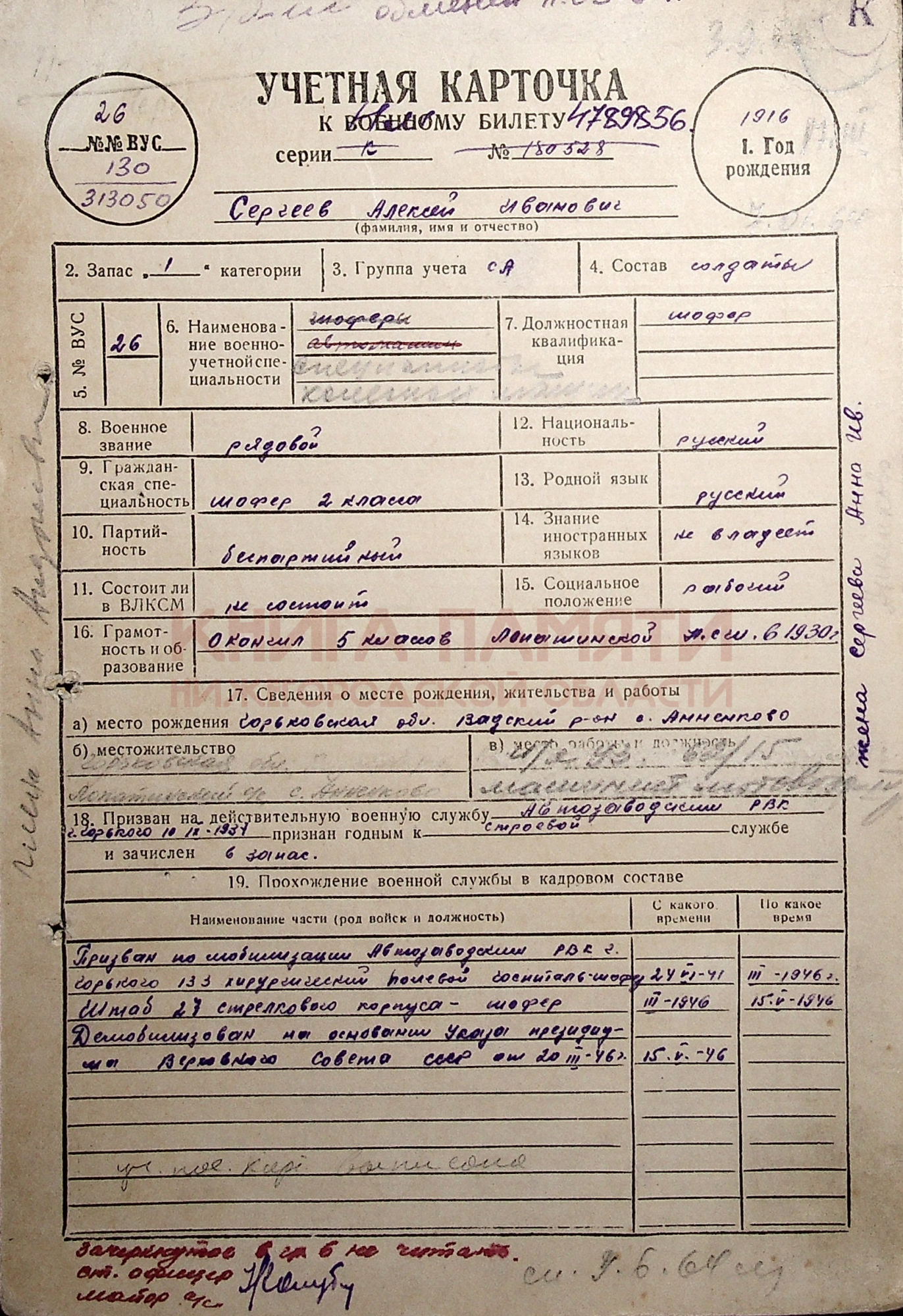 133 хирургический полевой госпиталь, Штаб 27 стрелкового корпуса, шофер