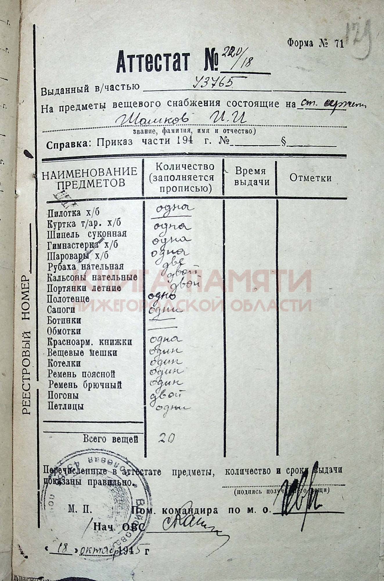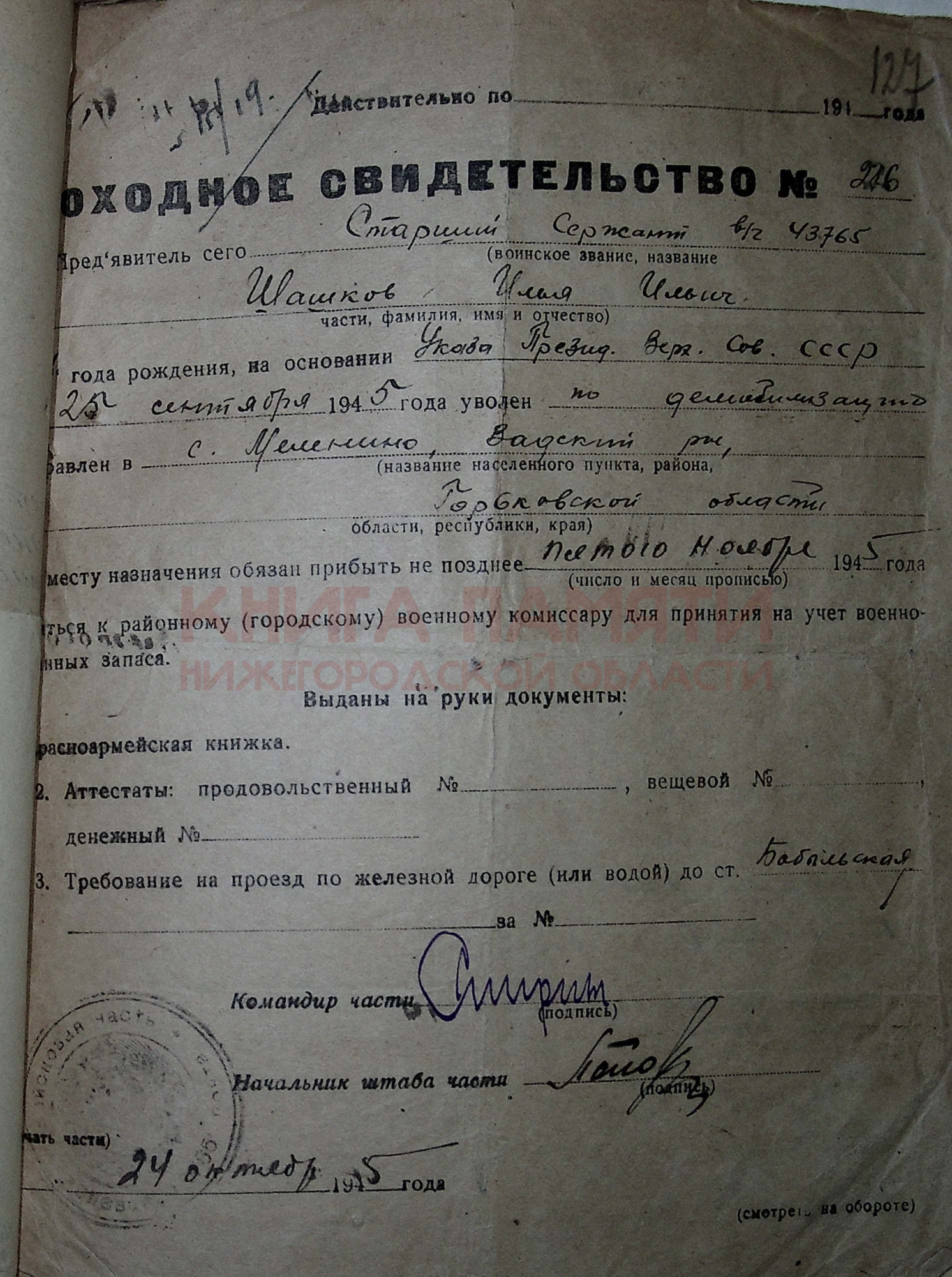 После поздравления зачислили И. И. Шашкова в запасную дивизию, командовал отделением снайперов, готовил их к фронту. Домой вернулся в ноябре сорок пятого.